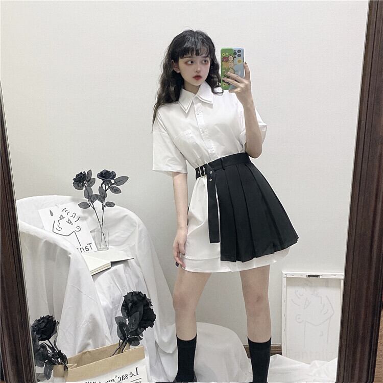 ダークワンピースブラックプリーツスカート シャツ セット Butterflyデザイン チェーン ミドル丈 CHIL57339432289