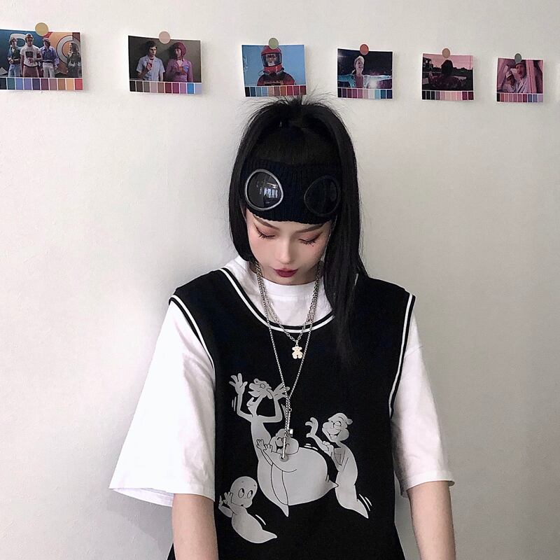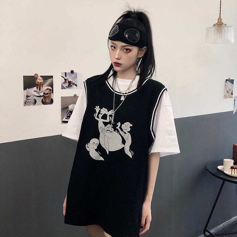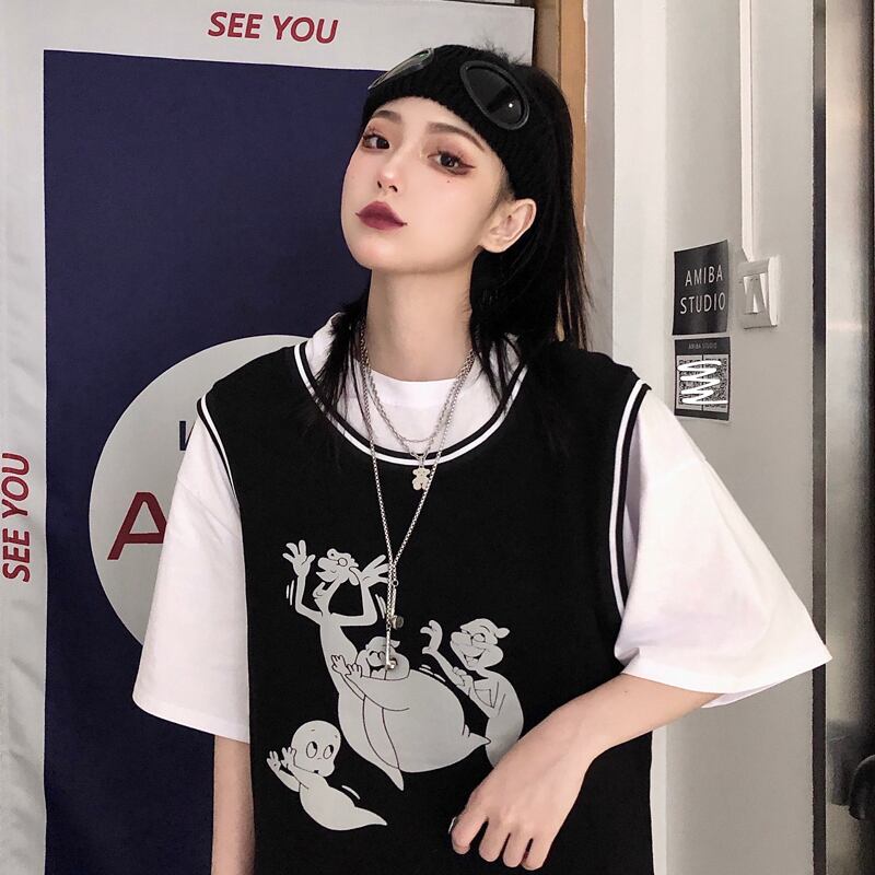 Tシャツレディース夏服トレンドダークプリント柄トップス 夏物 ステッチ CHIL69618591580
