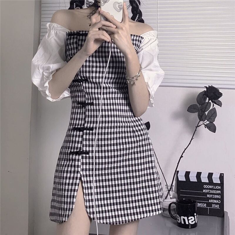 ワンピースレディース夏服韓国ファッショントレンドスタンダード格子柄カラー薄手スカート レトロ 夏物 CHIL63883772297