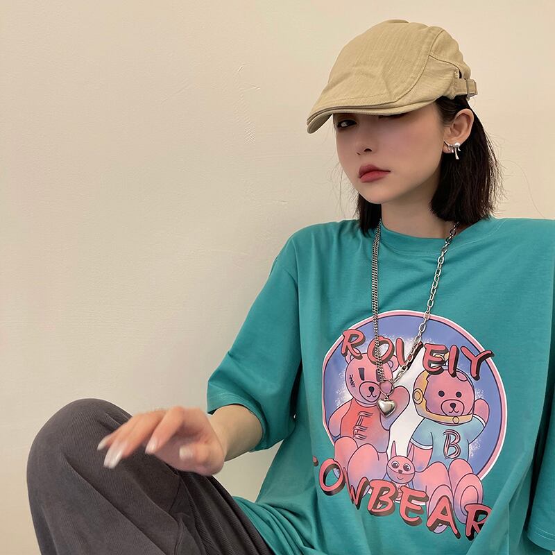レディース夏服韓国ファッショントレンドスタイルプリント柄ルーズTシャツトップス 原宿 夏物 CHIL26219108643