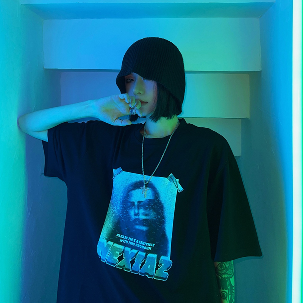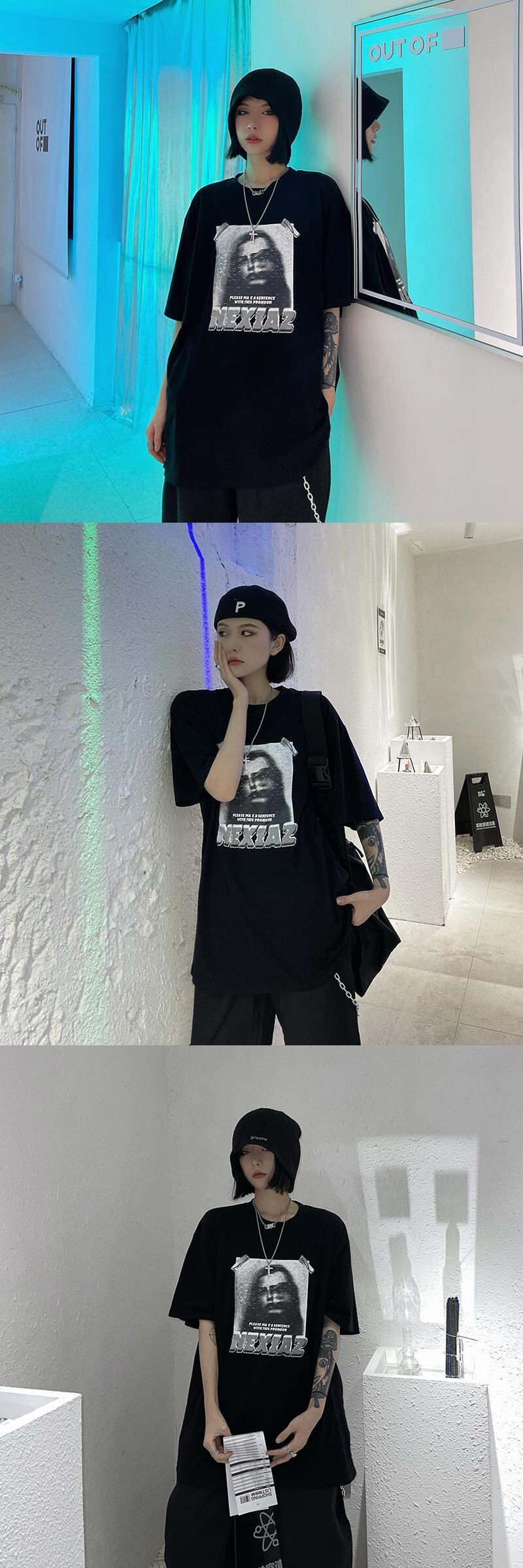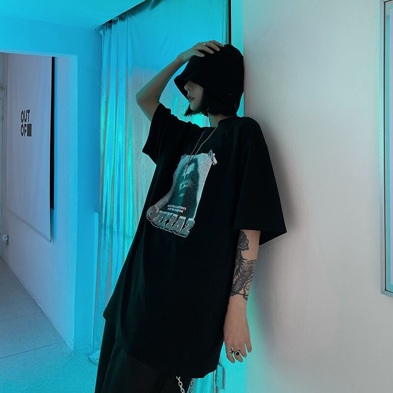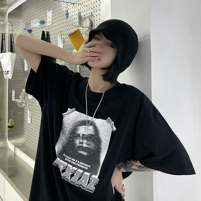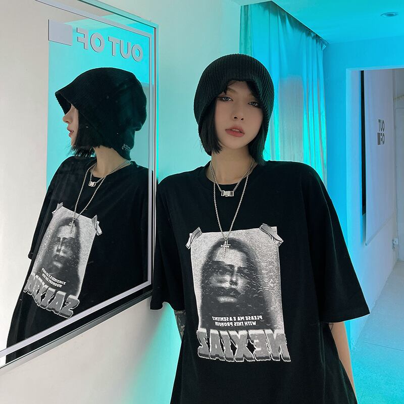 夏服韓国ファッションダークスタイルスタンダードプリント柄ルーズTシャツトップス レディーストレンド レトロ 夏物 CHIL12023926772