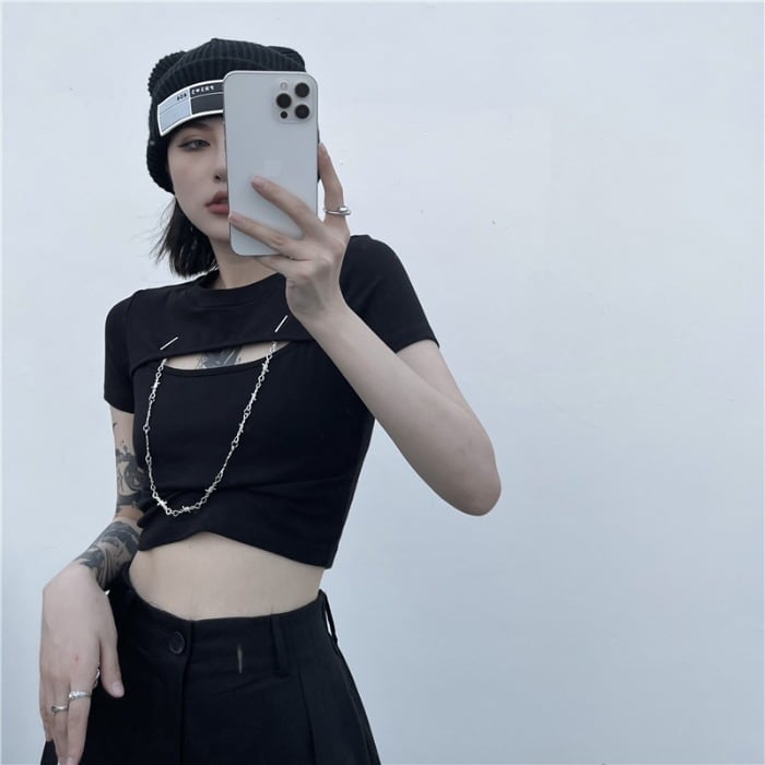 ブラックショートトップス 夏服トレンドチェーン スリムTシャツ 夏物 CHIL50904239128