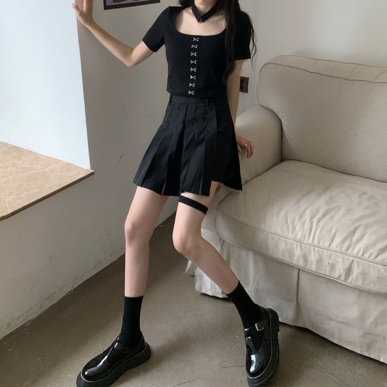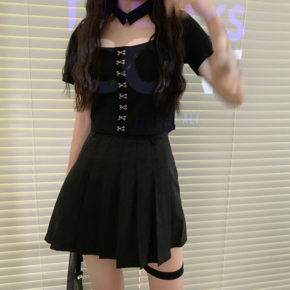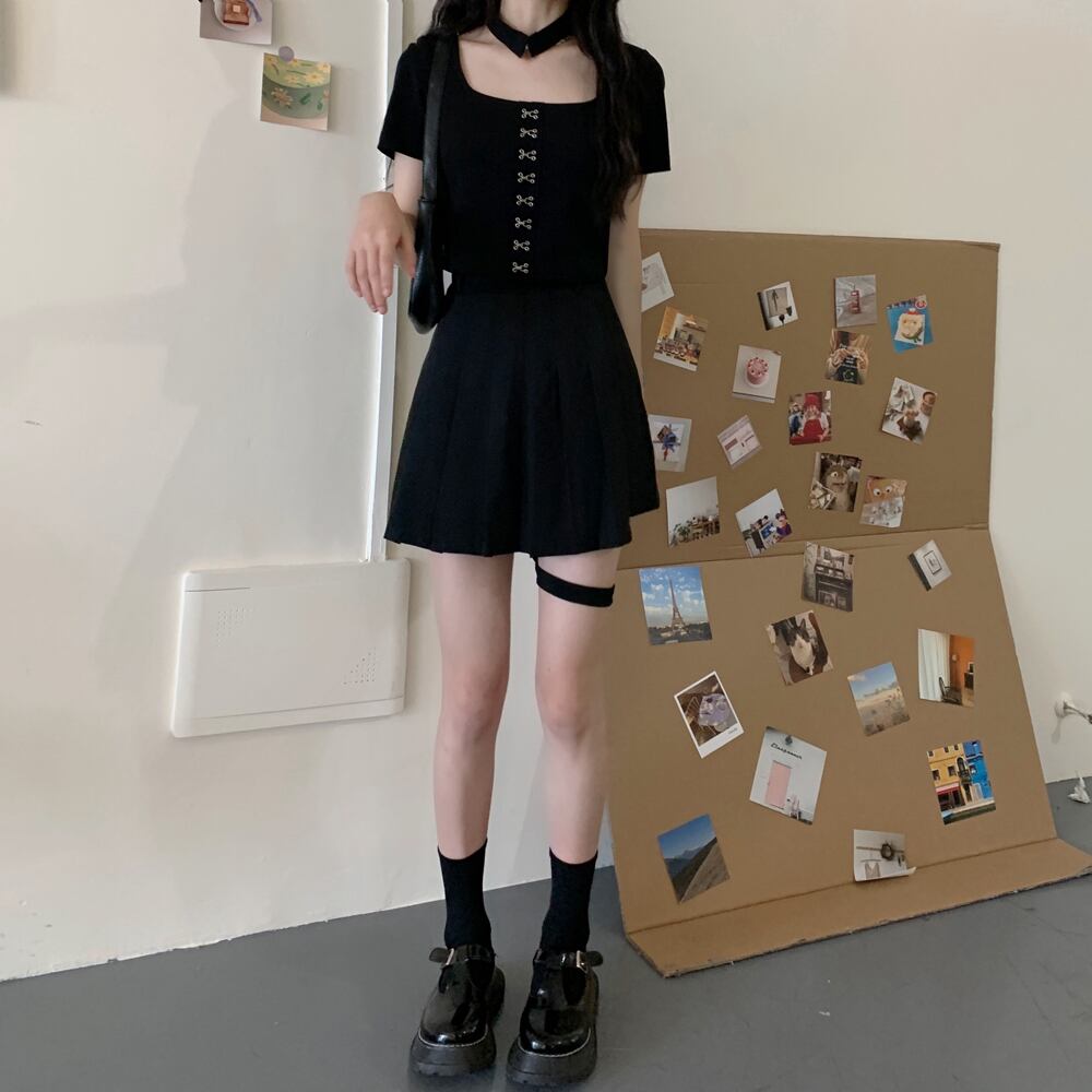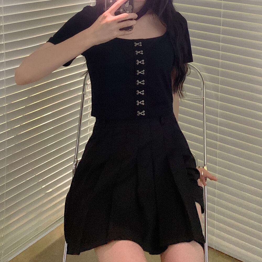 ダークスリムショートTシャツハイウェストウェストプリーツスカート スクウェア ウエスト CHIL59357916250