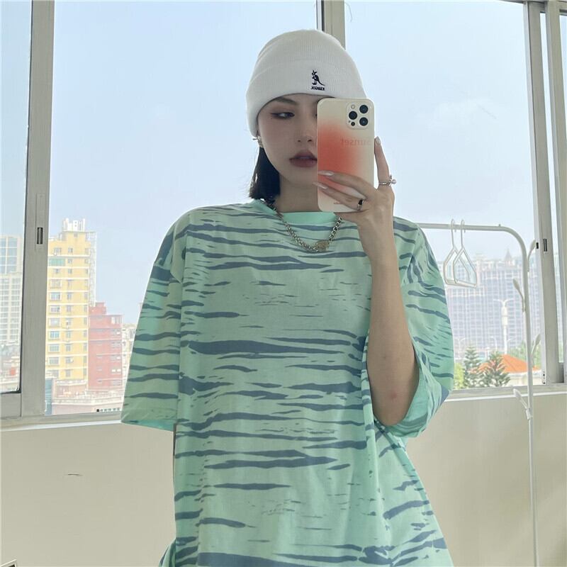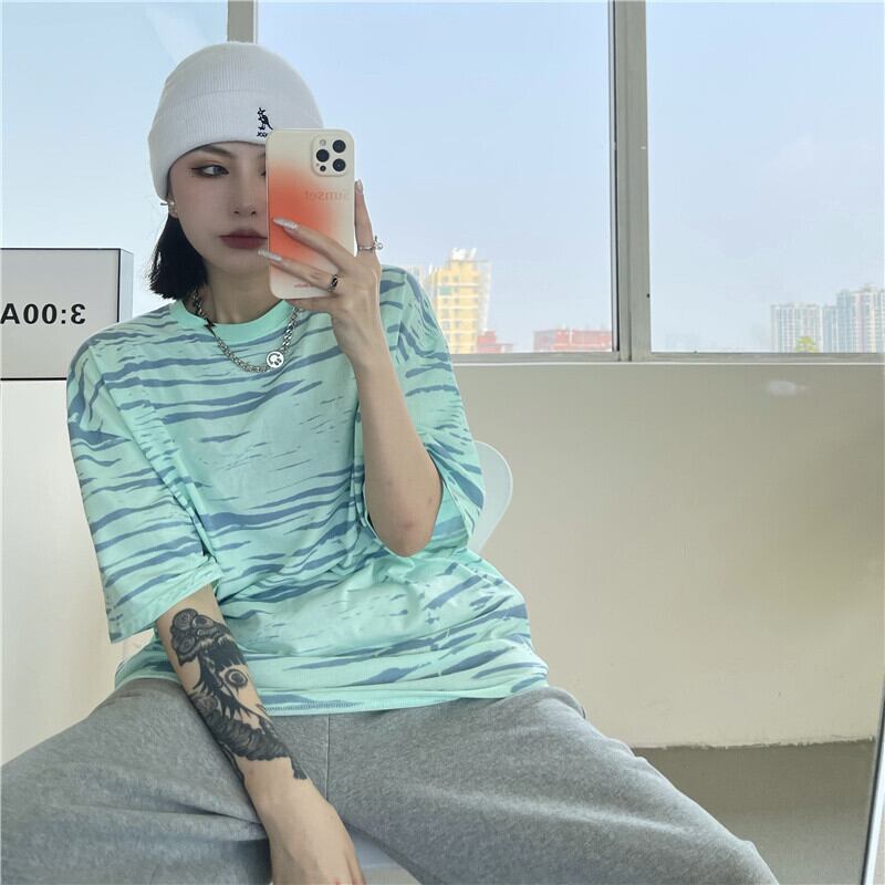 ルーズブラウス ラウンドネックブルーホワイトTシャツ Oネック CHIL54358322461