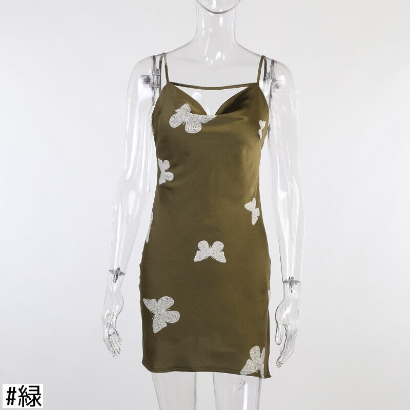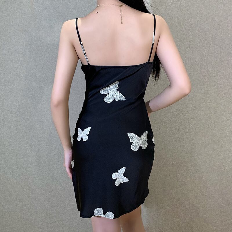 ダークブラックButterflyデザイン プリント柄ショートスカート バックVネックワンピース YU34410013890