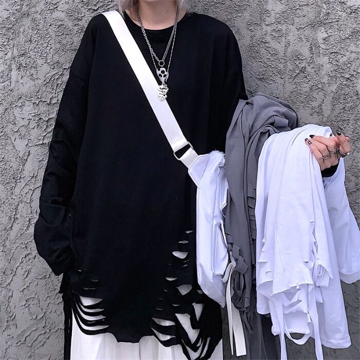 ゆったりシャツ 秋物ウィンター韓国ファッショントレンドダークブラックルーズラウンドネックTシャツトップス ロング ストリート オータム 冬物 Oネック ボーイズ スタイル 長袖 デーモン8655484853