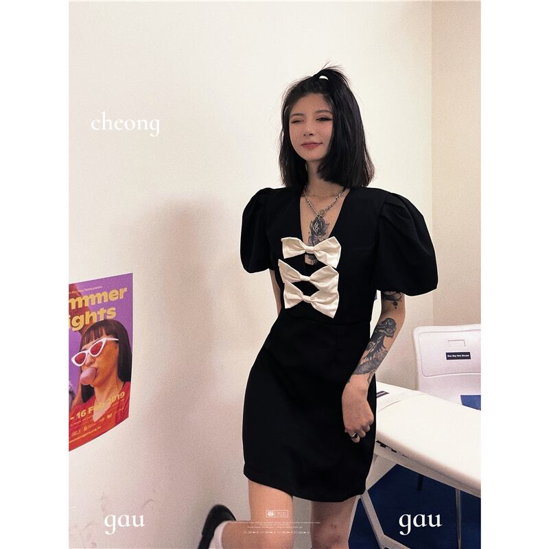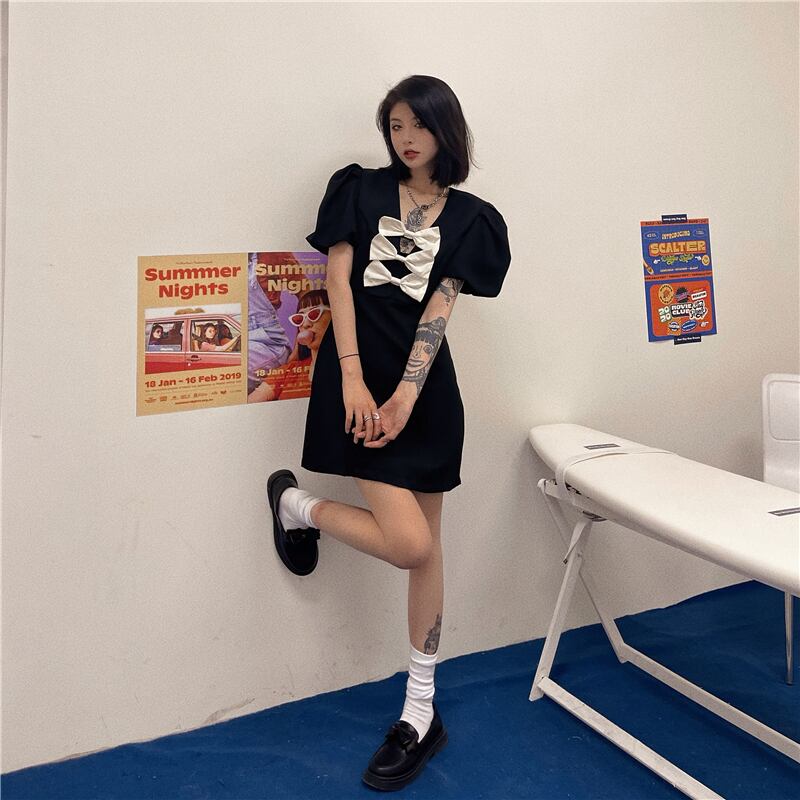 スタイルワンピースレディース夏服スリーブブラックVネックAラインスカート リボン 夏物 デーモン89475483607