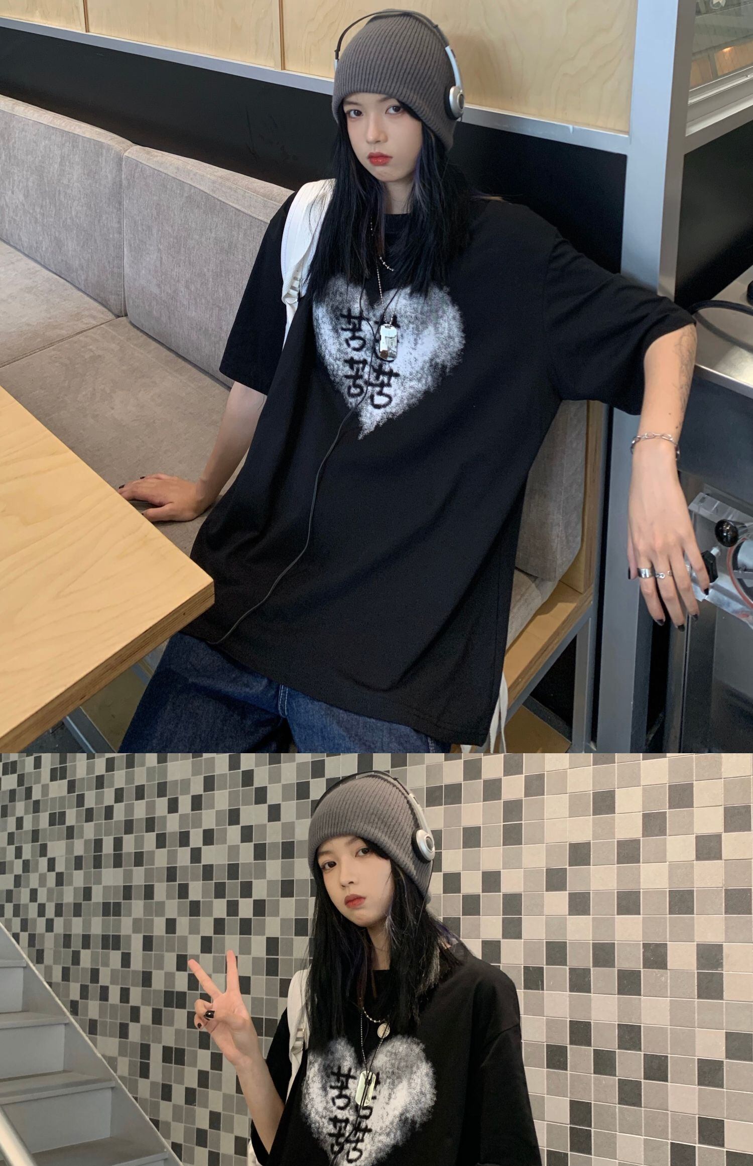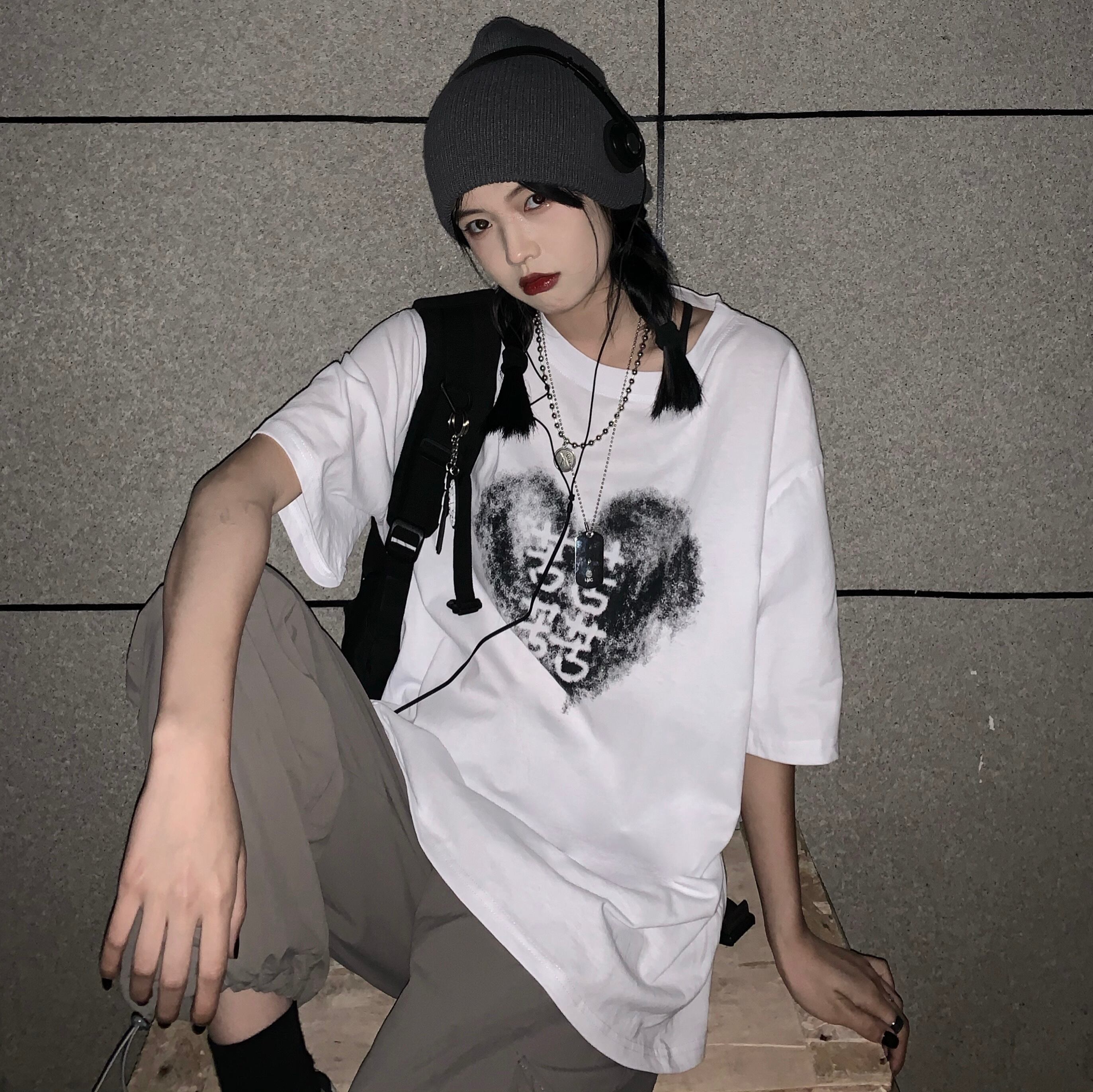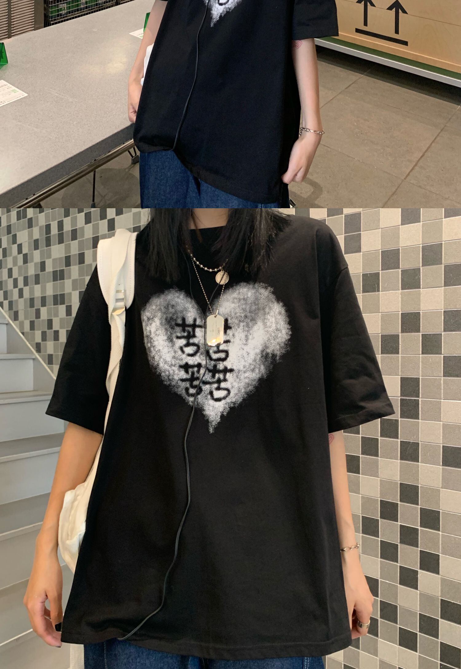 トップス レディース夏服韓国ファッショントレンドスタンダードプリントルーズブラックTシャツ レトロ 夏物 スタイル デーモン17439071993