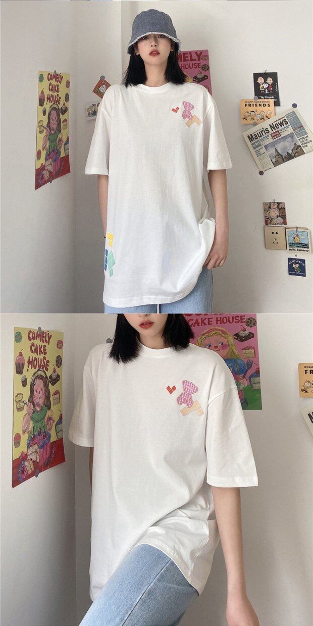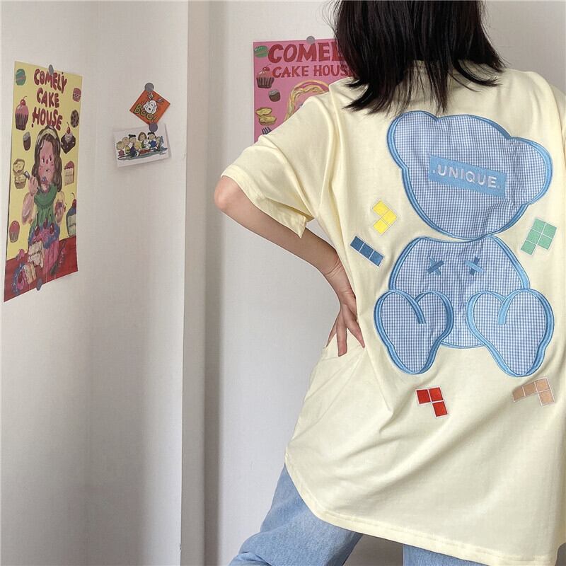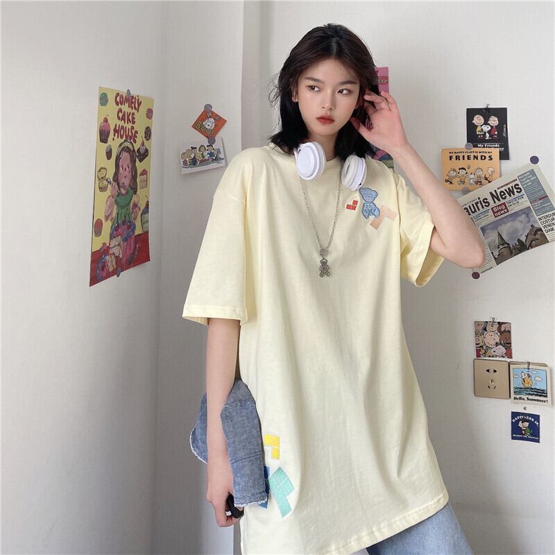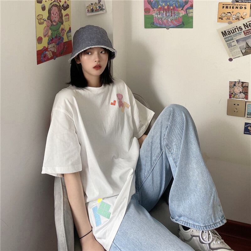 Tシャツレディース夏服韓国ファッショントレンド刺繍格子柄ルーズトップス 夏物 スタイル デーモン71646540683