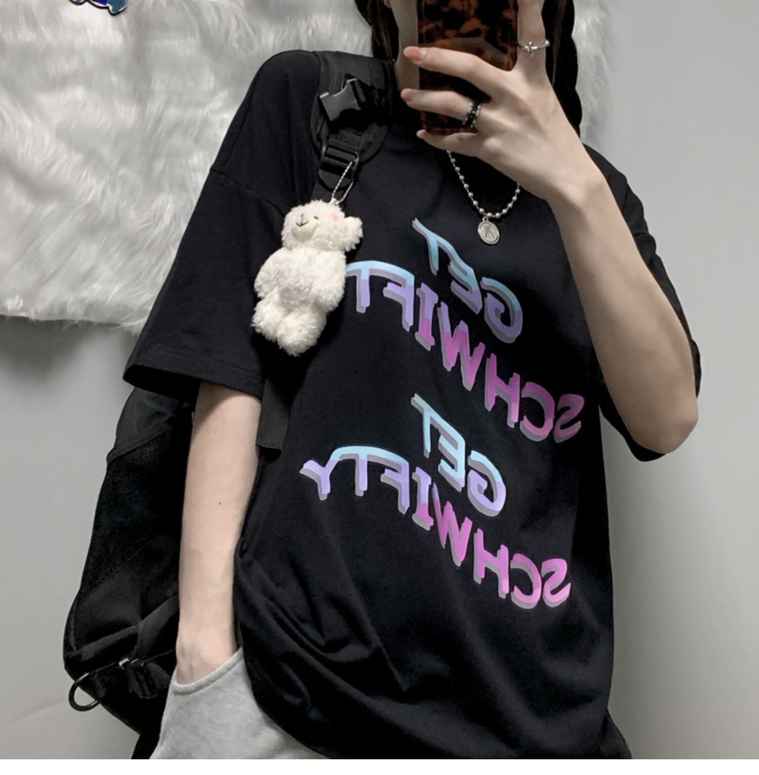 トップス Tシャツレディース夏服韓国ファッショントレンドプリントブラックルーズ 夏物 スタイル デーモン9230945897
