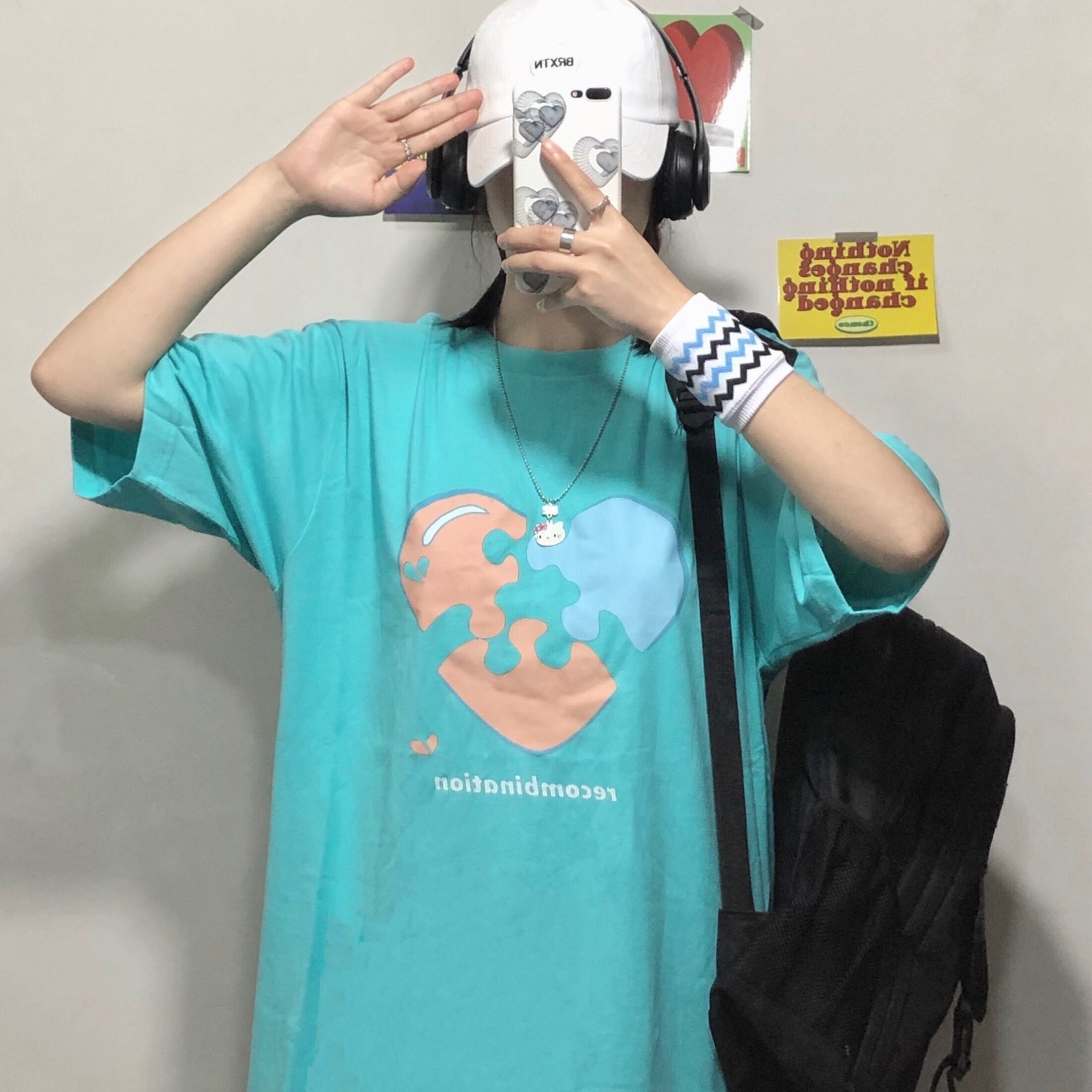 ブラックTシャツレディース夏服韓国ファッショントレンドプリントルーズトップス 原宿 夏物 ステッチ スタイル デーモン103720144