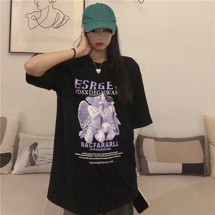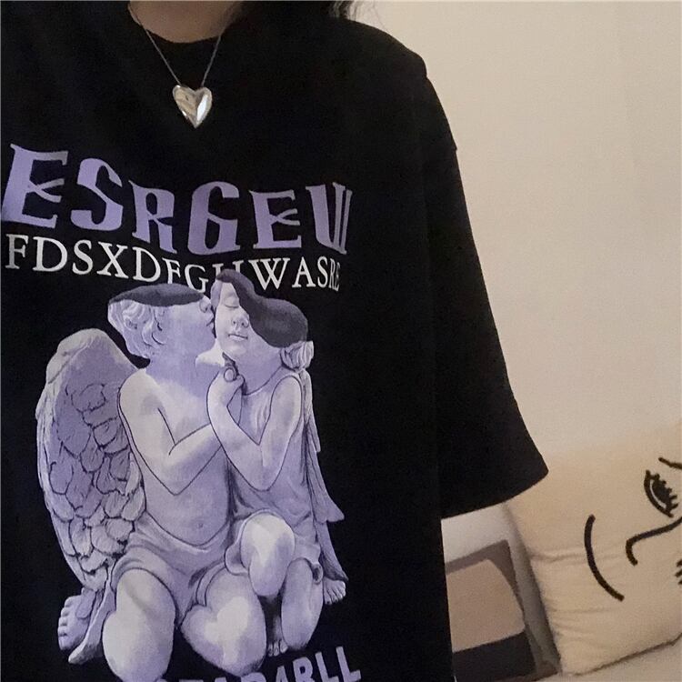 夏服シャツ プリントルーズラウンドネック半袖スリーブTシャツメンズレディース ショート ハーフスリーブ 原宿 夏物 Oネック パープル CHIL41058614763