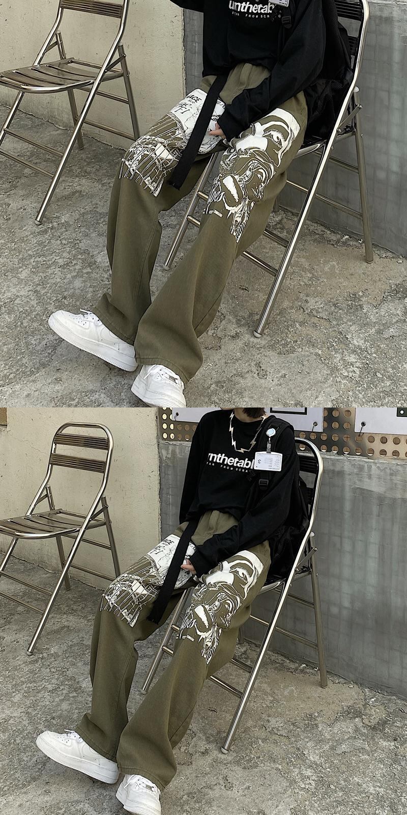 ジーンズ レディーススプリング秋物韓国ファッショントレンドメンズプリントカジュアルルーズグリーンパンツ 春物 オータム スタイル CHIL59978744614
