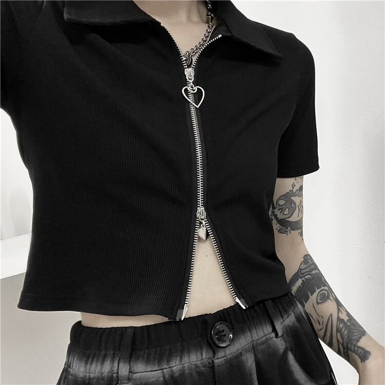ショート夏服レディース韓国ファッショントレンドダークジッパースリムトップス Tシャツ 夏物 スタイル デーモン78292233375