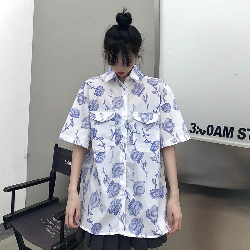 シャツ レディース夏服韓国ファッショントレンドFlowerデザイン プリント柄ホワイトルーズトップス 夏物 フラワーデザイン スタイル デーモン15999260382