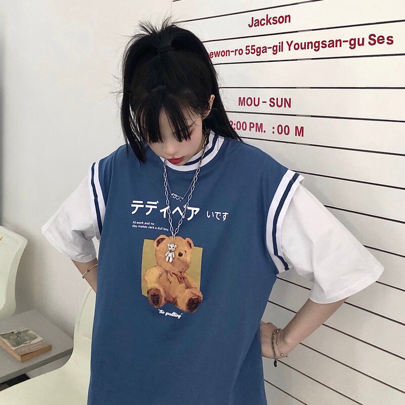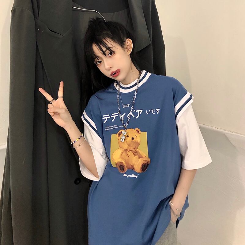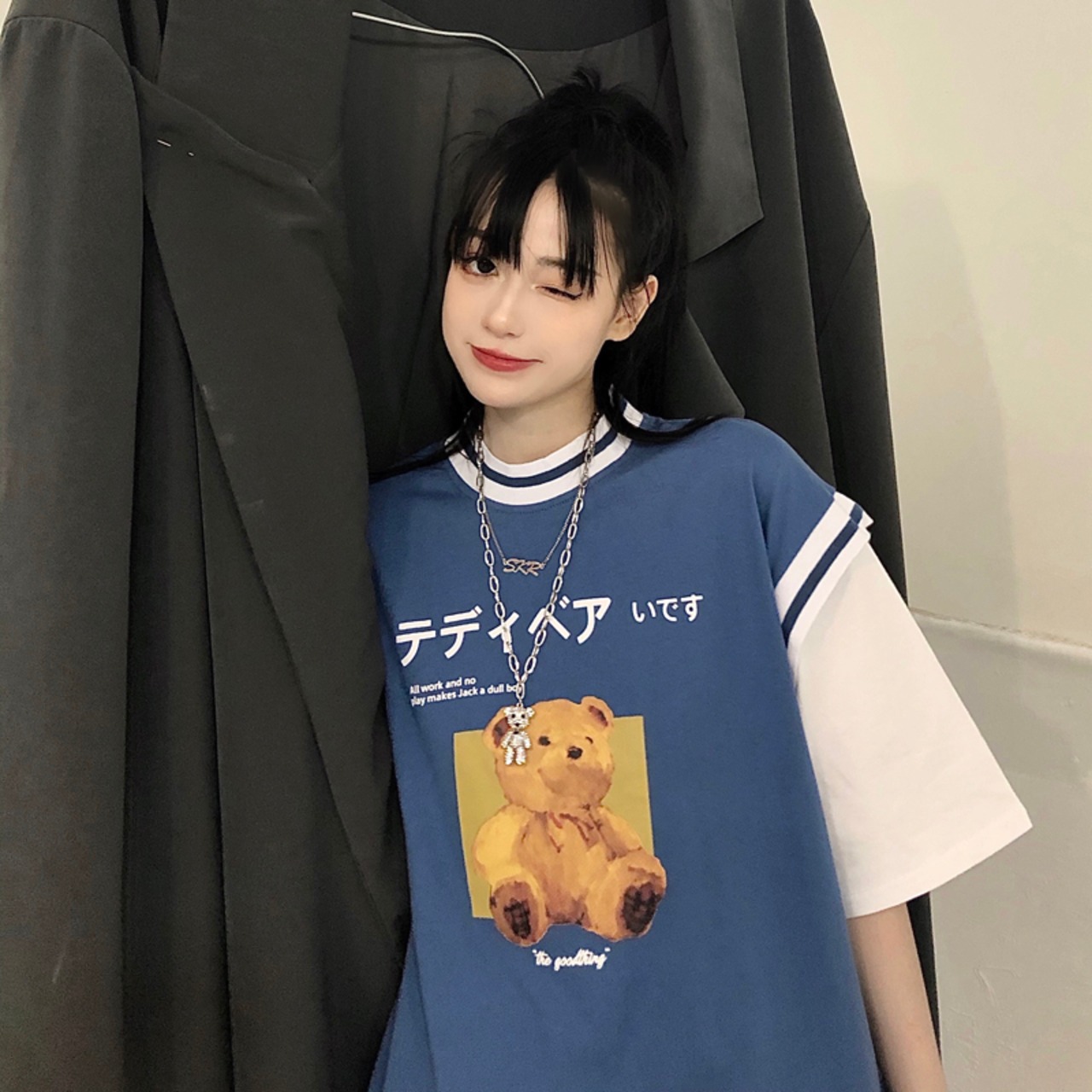 トップス ツーピース夏服レディース韓国ファッショントレンドスタンダードプリント柄ルーズTシャツ レトロ 夏物 ボーイズ スタイル デーモン79409735880