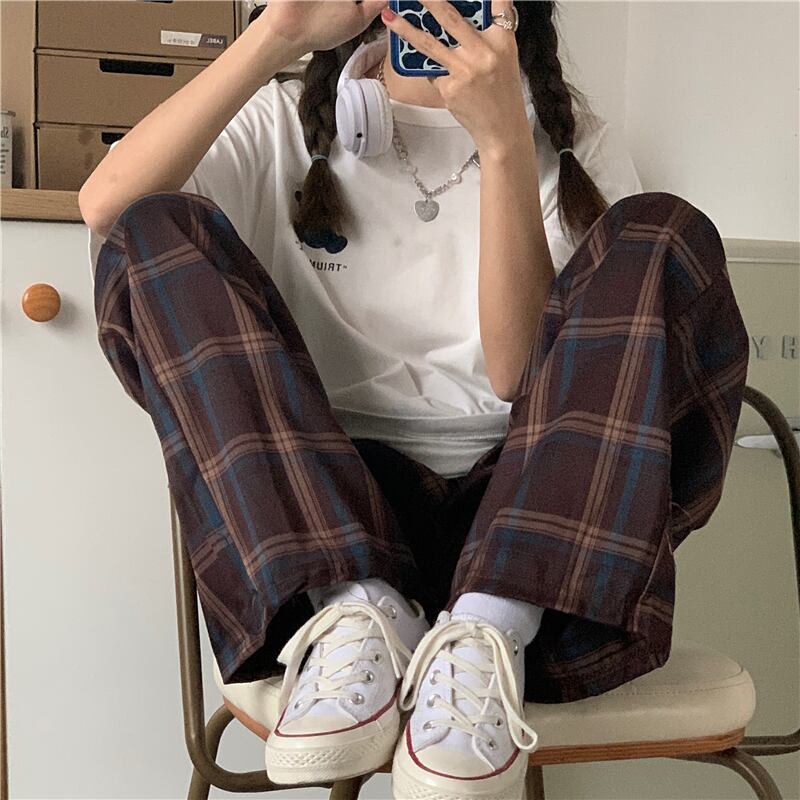 格子柄パンツ レディース韓国ファッショントレンドルーズハイウェスト薄手カジュアル スタイル ウエスト CHIL47281228585
