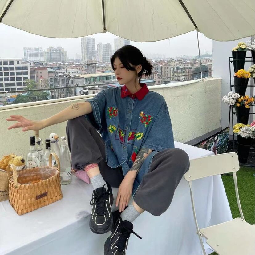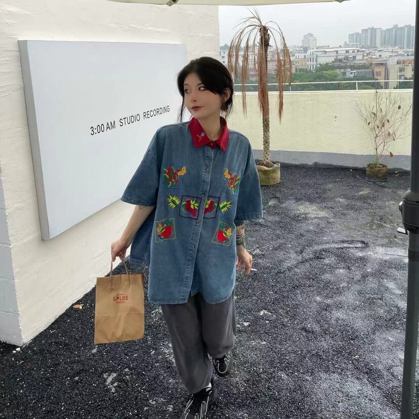 夏服レディース韓国ファッションカジュアルルーズトレンドスタイルシャツ レッド 刺繍 夏物 CHIL56688657841