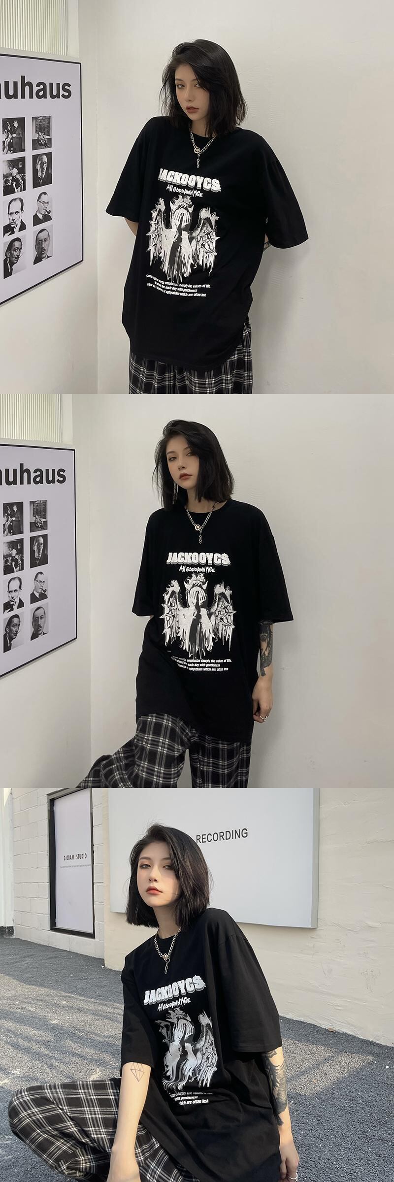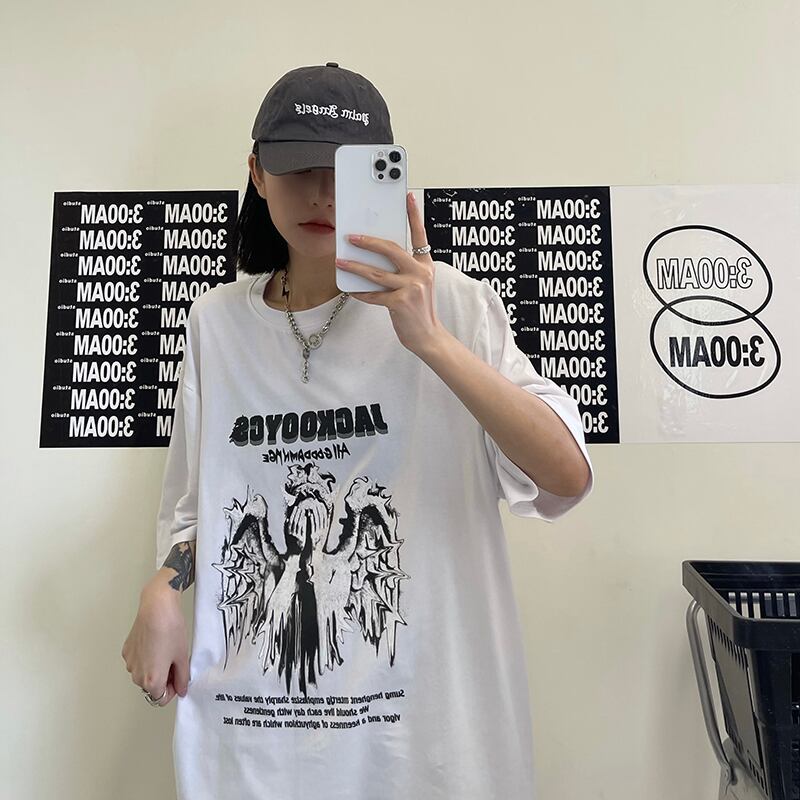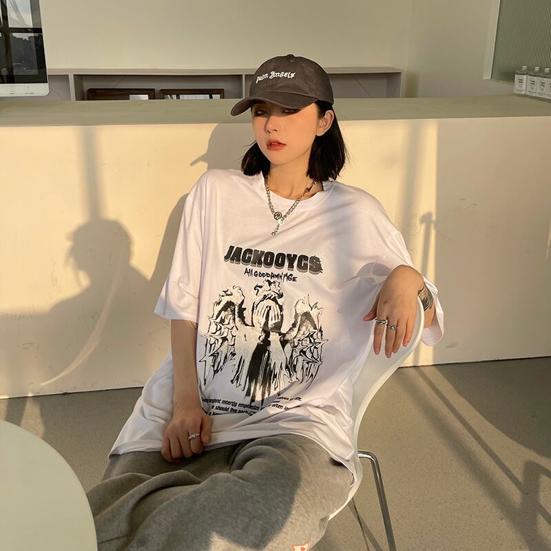 トレンドダークプリント柄ルーズ半袖スリーブTシャツレディース ショート ハーフスリーブ 原宿 CHIL63136824069