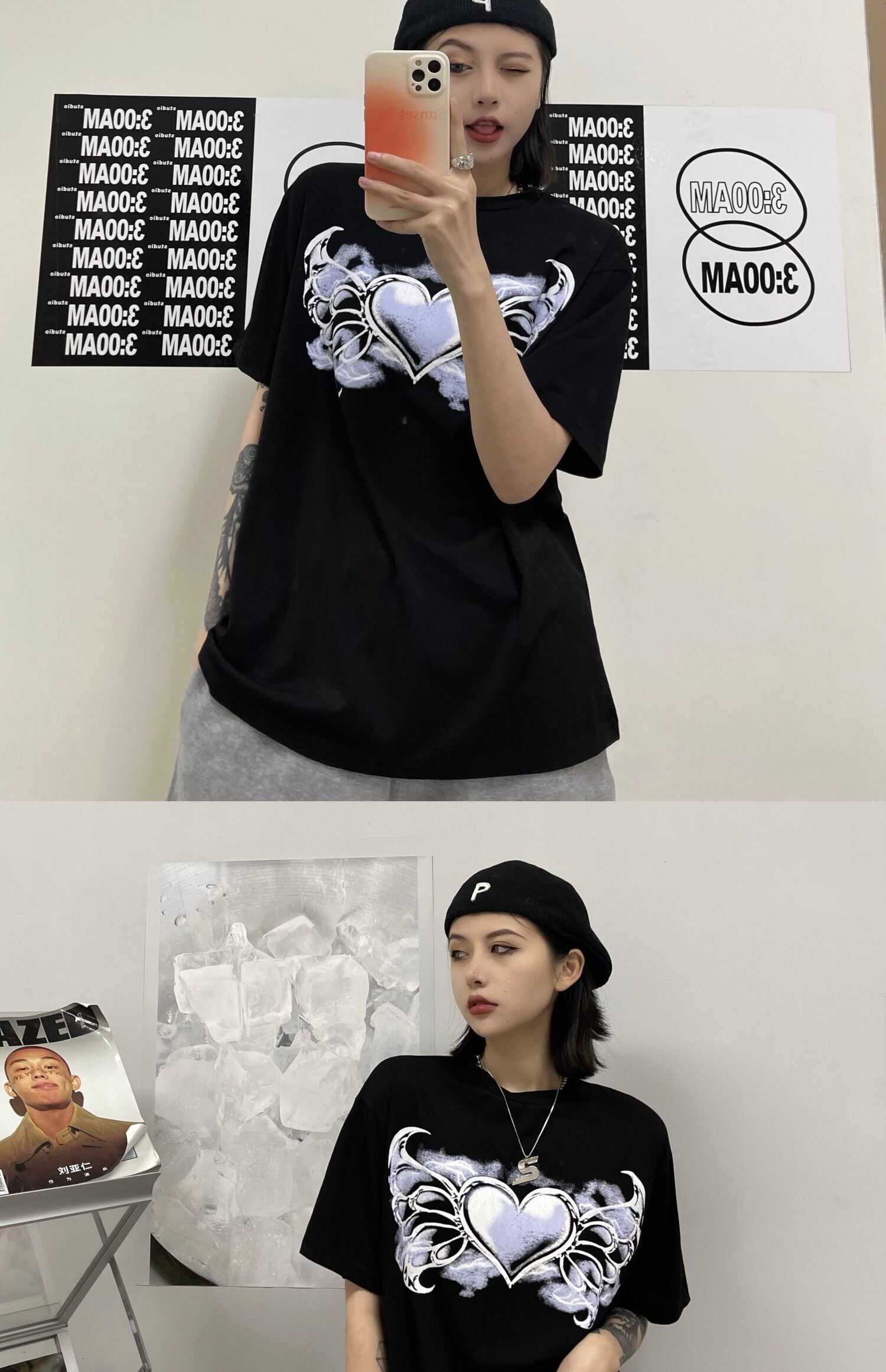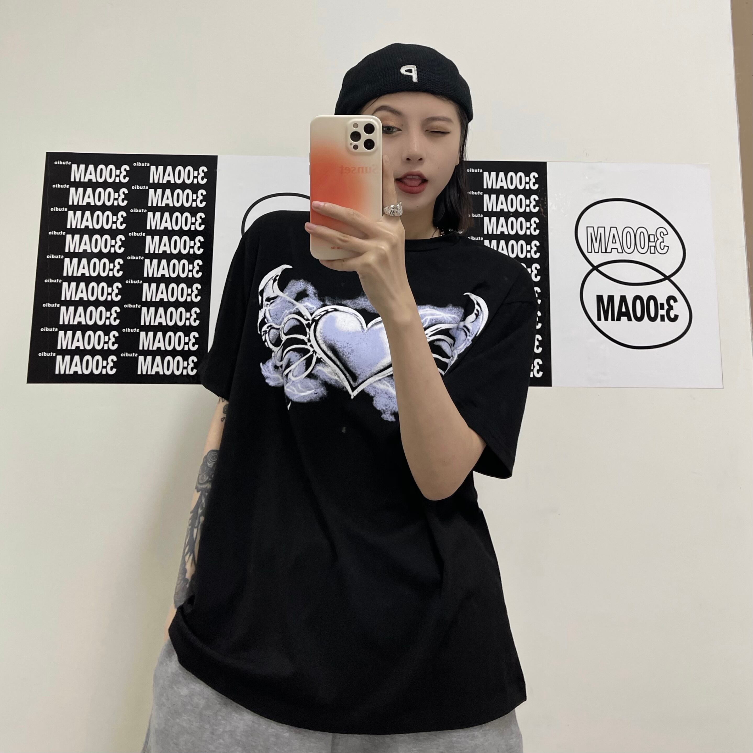 ブラックTシャツレディース夏服韓国ファッショントレンドダークハートプリント柄ルーズトップス 夏物 スタイル デーモン39044377062