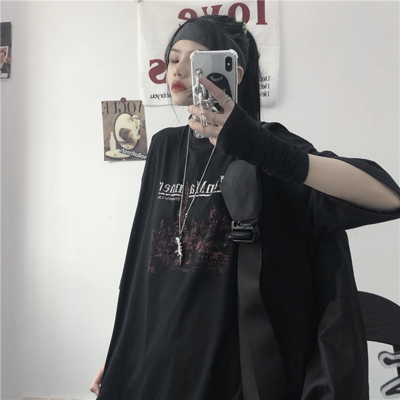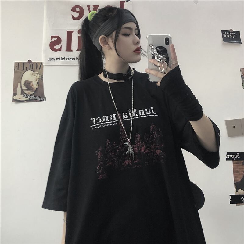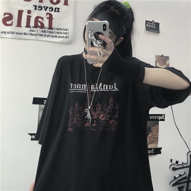 Tシャツレディース夏服韓国ファッショントレンドスタンダードプリントブラックルーズトップス レトロ 原宿 夏物 スタイル デーモン77636860779