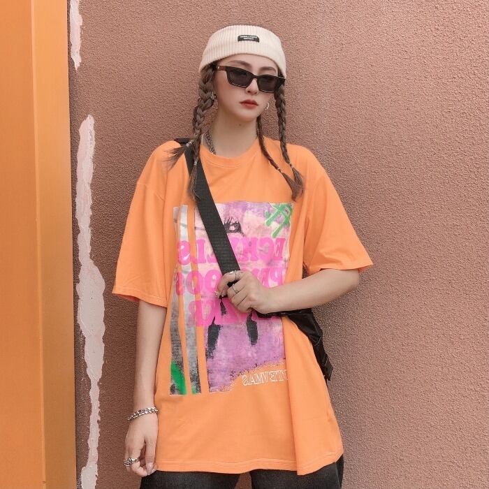 夏服韓国ファッショントレンドルーズラウンドネックプリントスタイルTシャツレディース ストリート 原宿 夏物 Oネック CHIL4175431687