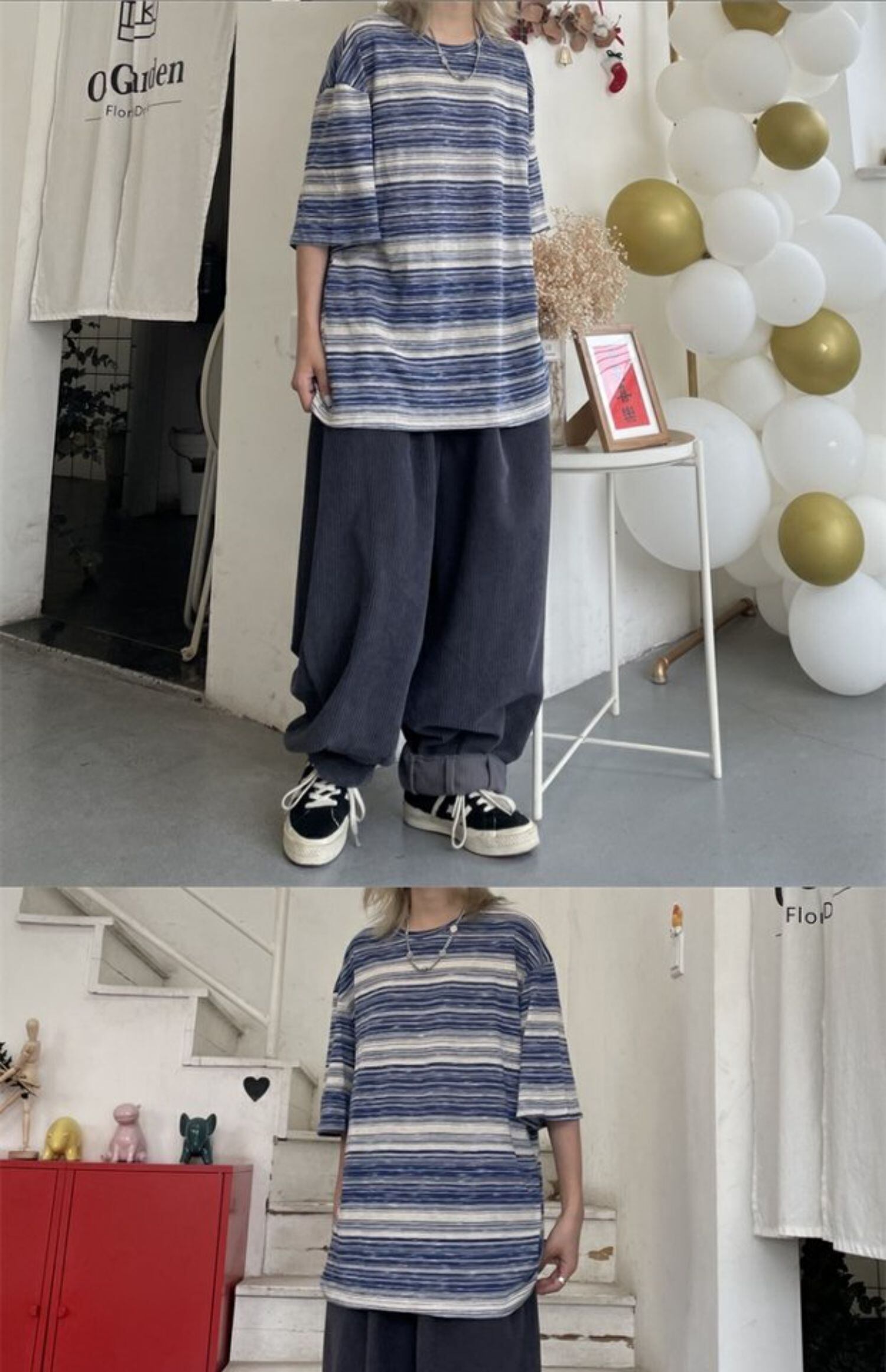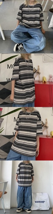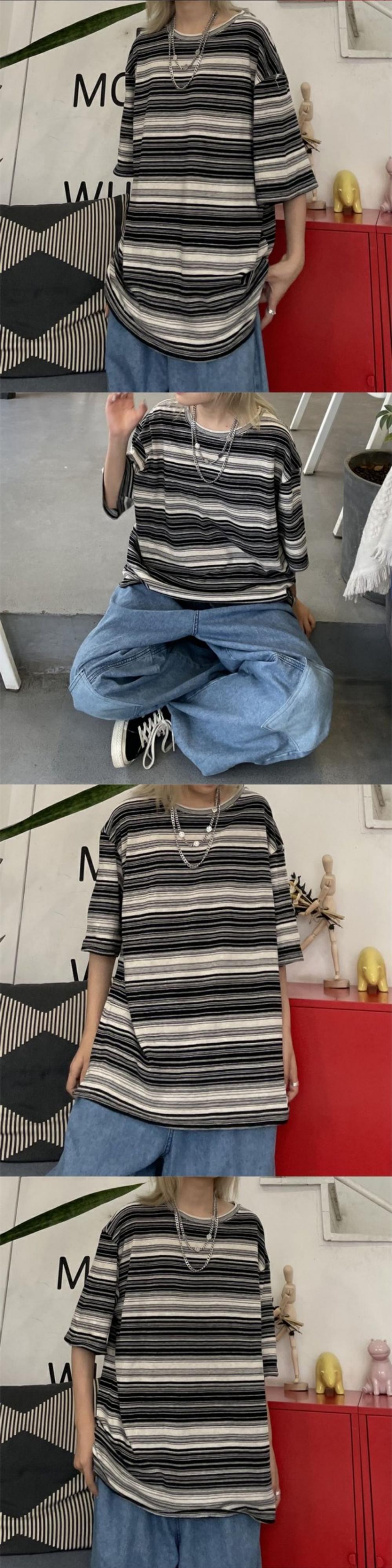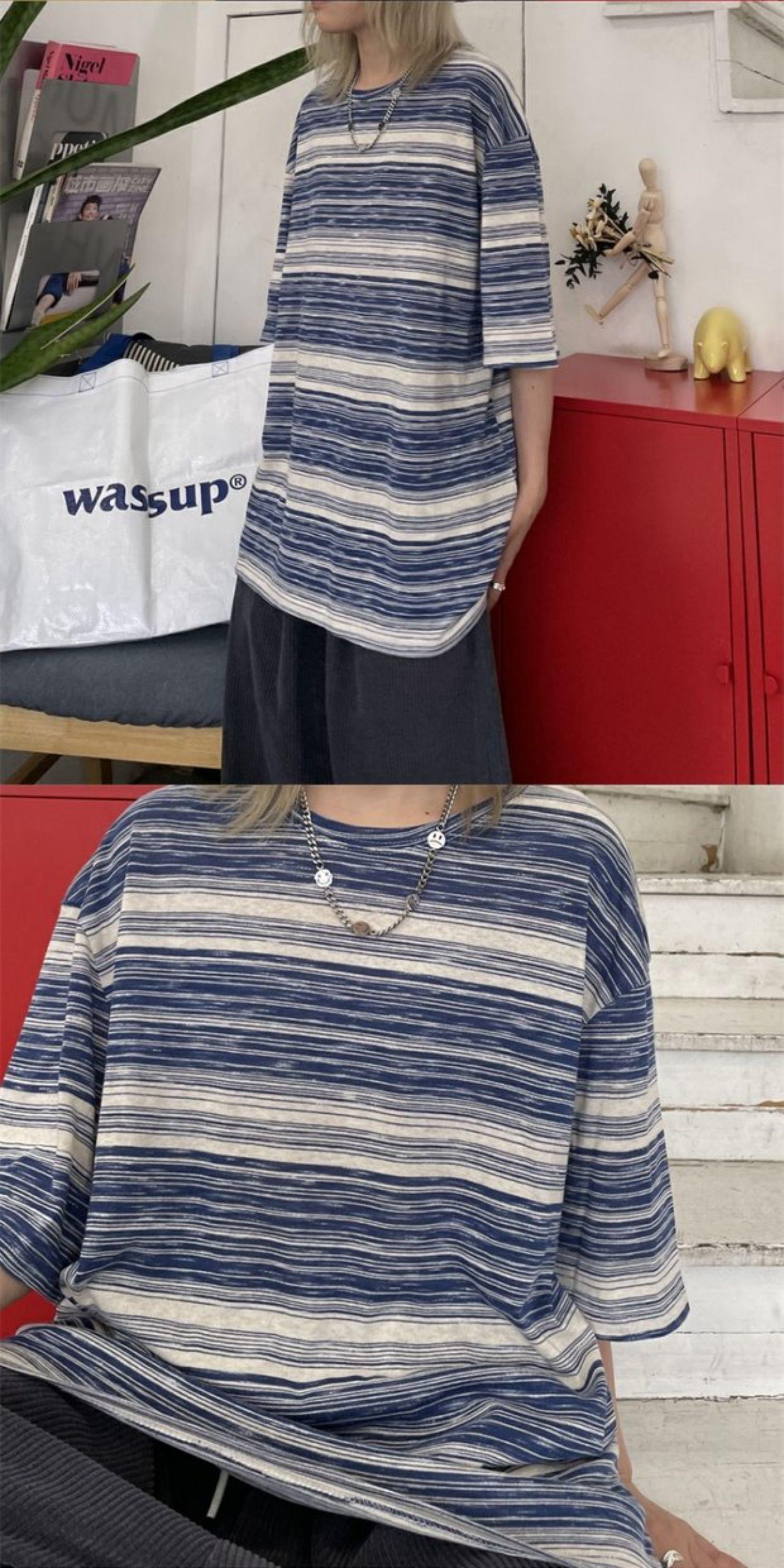 Tシャツレディース夏服韓国ファッショントレンドスタンダードストライプラウンドネックルーズトップス レトロ 夏物 Oネック スタイル デーモン4277159777