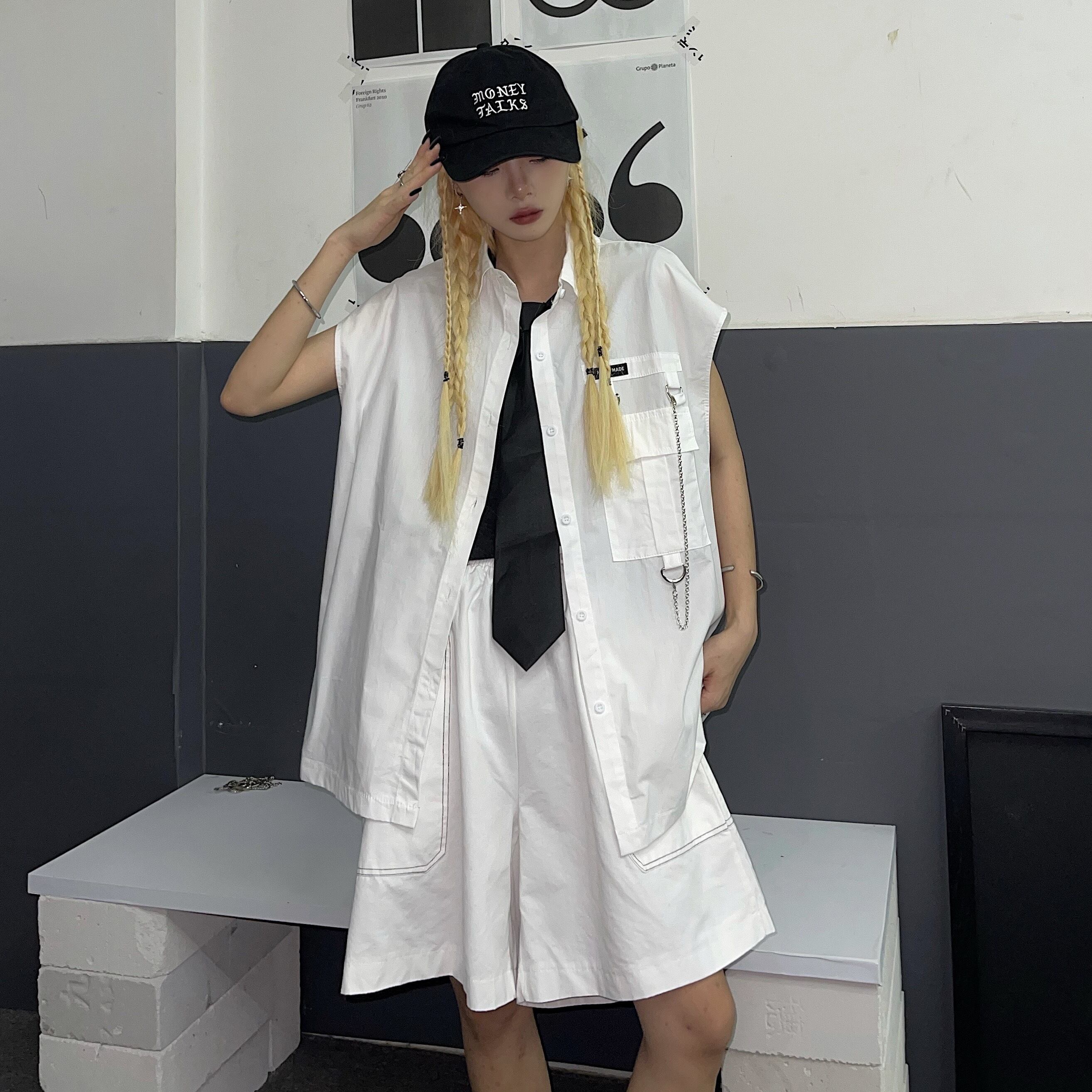 色:白のシャツ,黒いシャツ,ホワイトショーツ,黒のショートパンツ