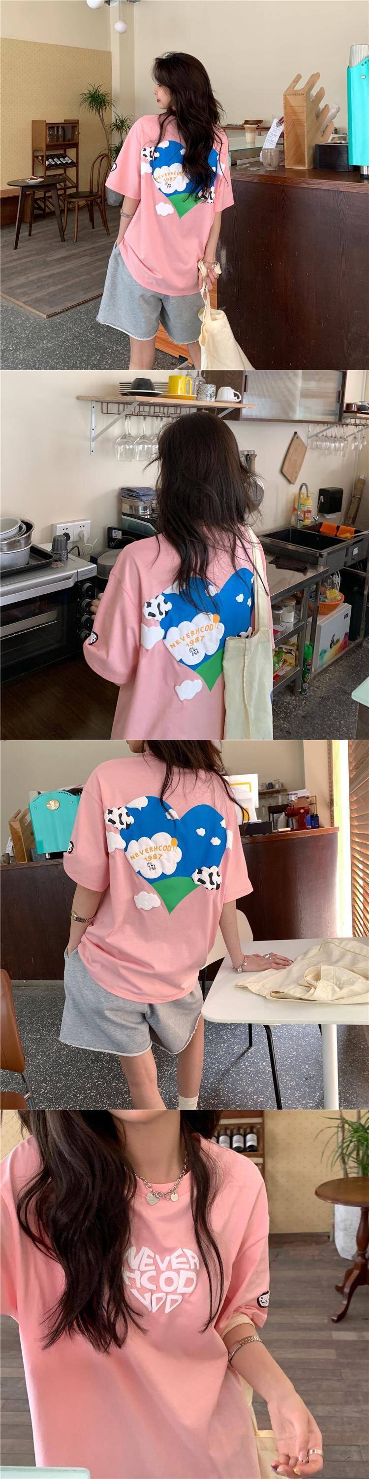 トレンドブルーホワイトプリントTシャツルーズラウンドネックトップス Oネック CHIL66147233972