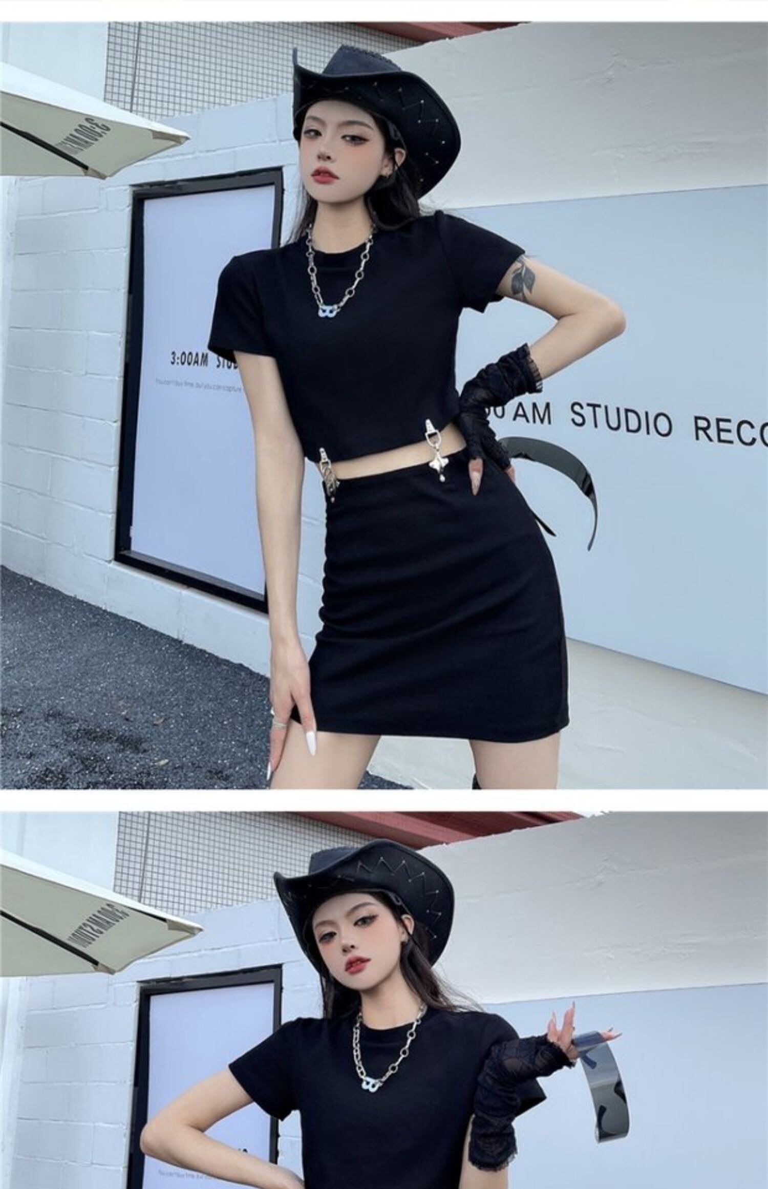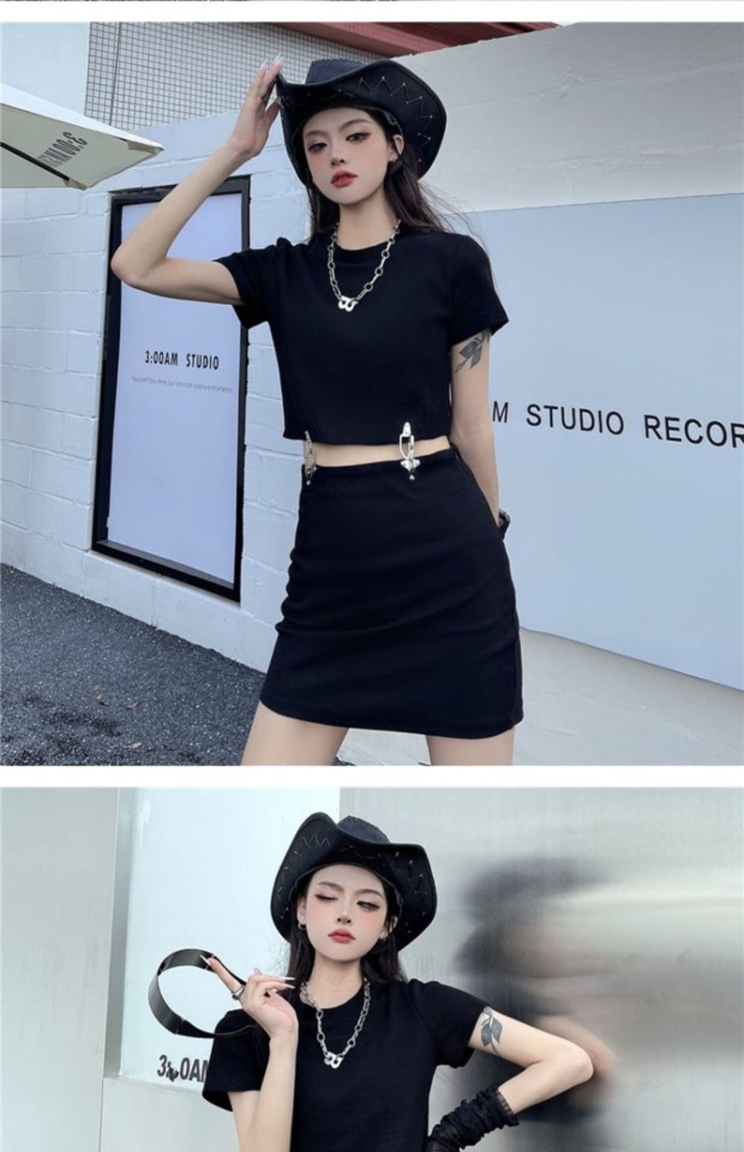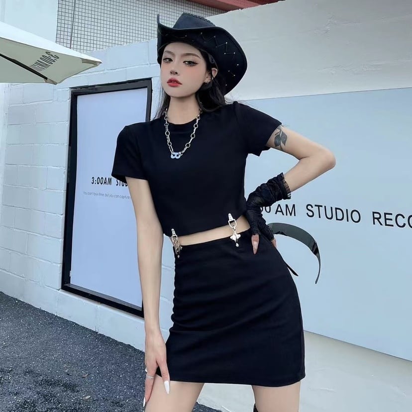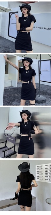 夏服レディーストレンドショートスリムTシャツトップス ブラックスカート 夏物 デーモン75891273616
