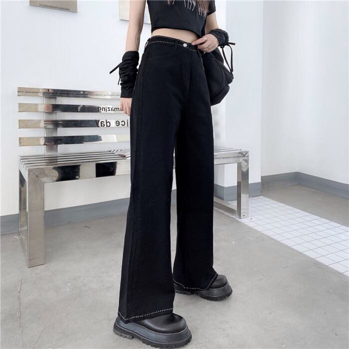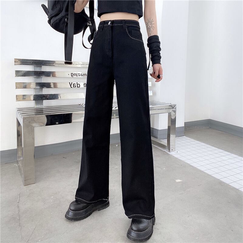 ブラックジーンズ レディース夏服トレンドスタンダード刺繍ワイドレッグパンツ ハイウェストウェストルーズ レトロ 夏物 ワイドパンツ ウエスト デーモン34888027234