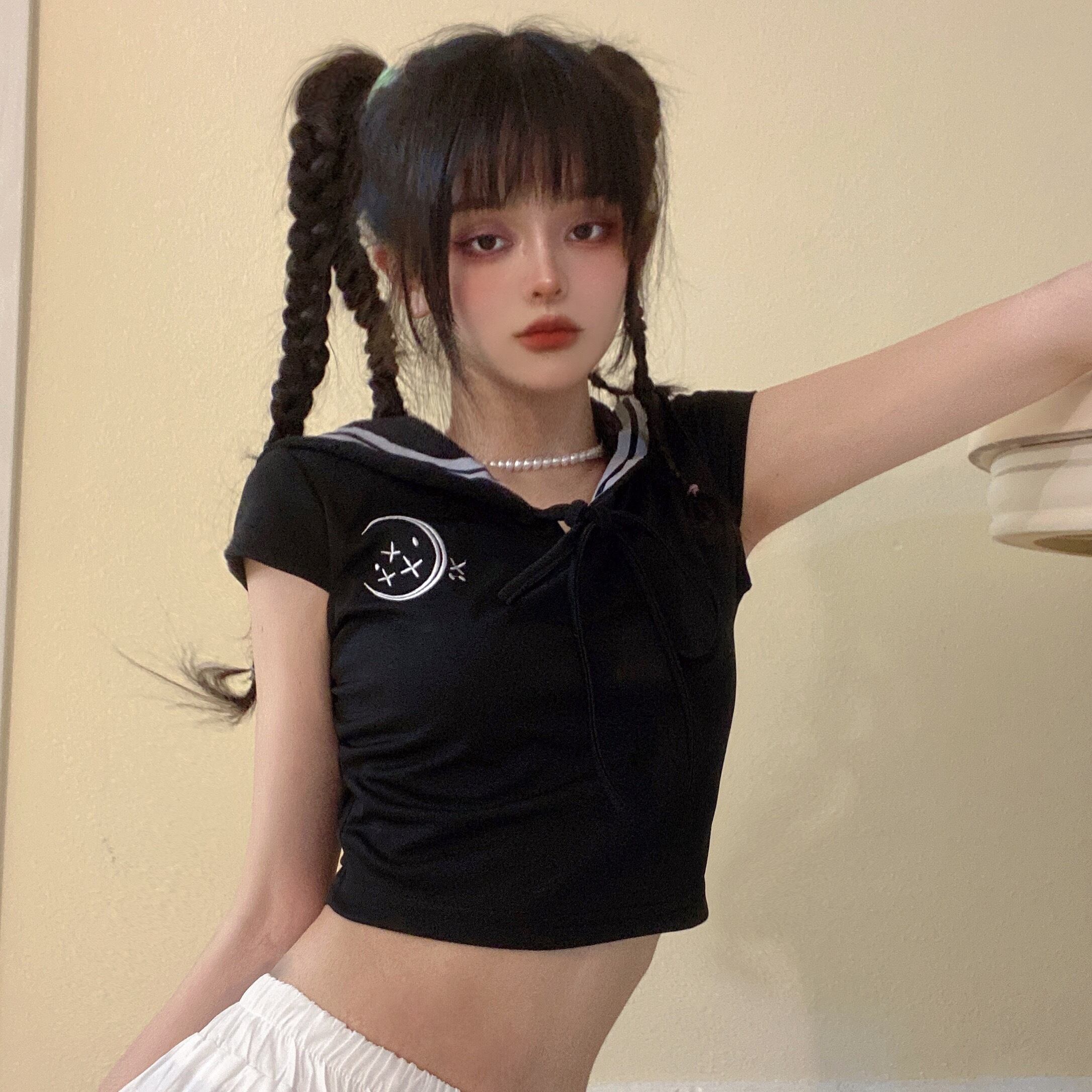 ショートTシャツレディース夏服韓国ファッショントレンドスタンダードネイビーカラートップス レトロ 夏物 ボーイズ スタイル デーモン56681531009