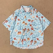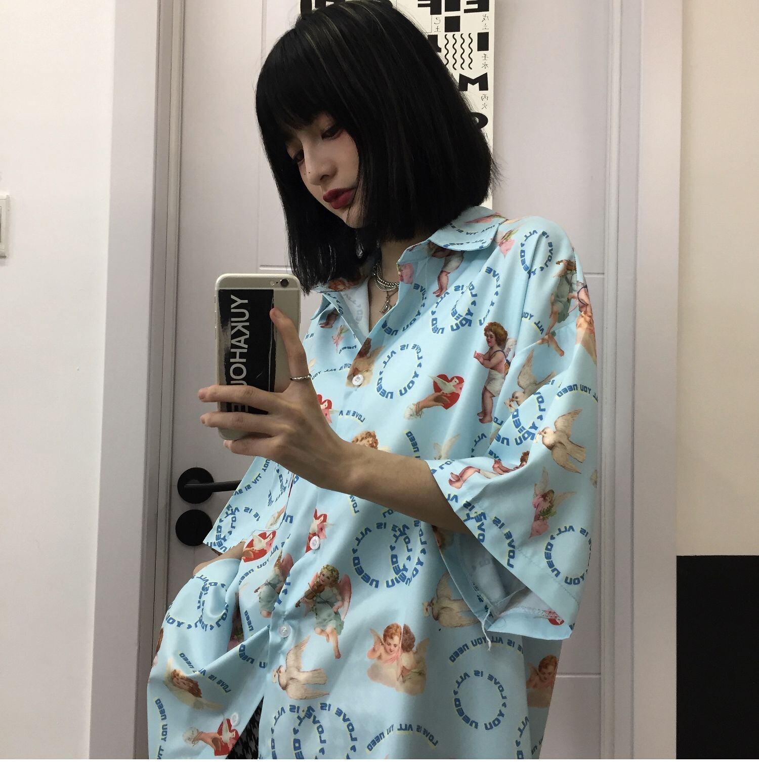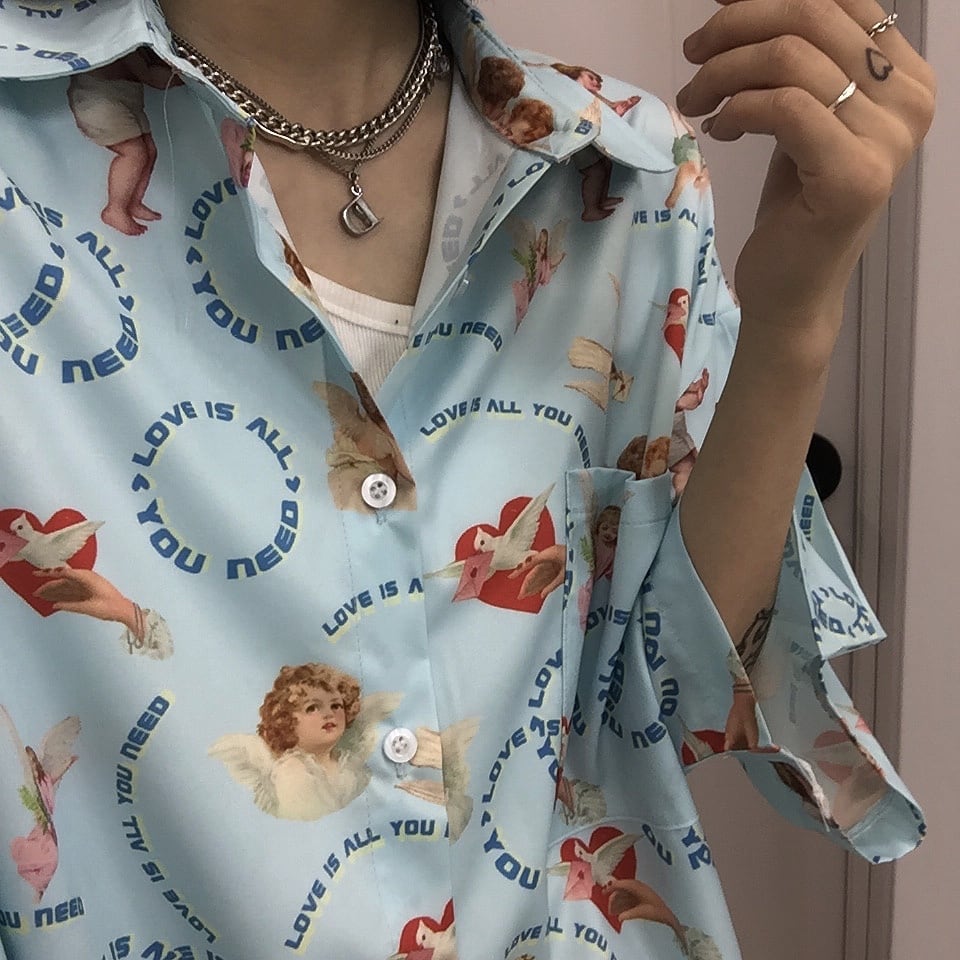 夏服シャツ レディース韓国ファッショントレンドスタンダードプリントルーズトップス レトロ 夏物 ボーイズ スタイル デーモン48325918082