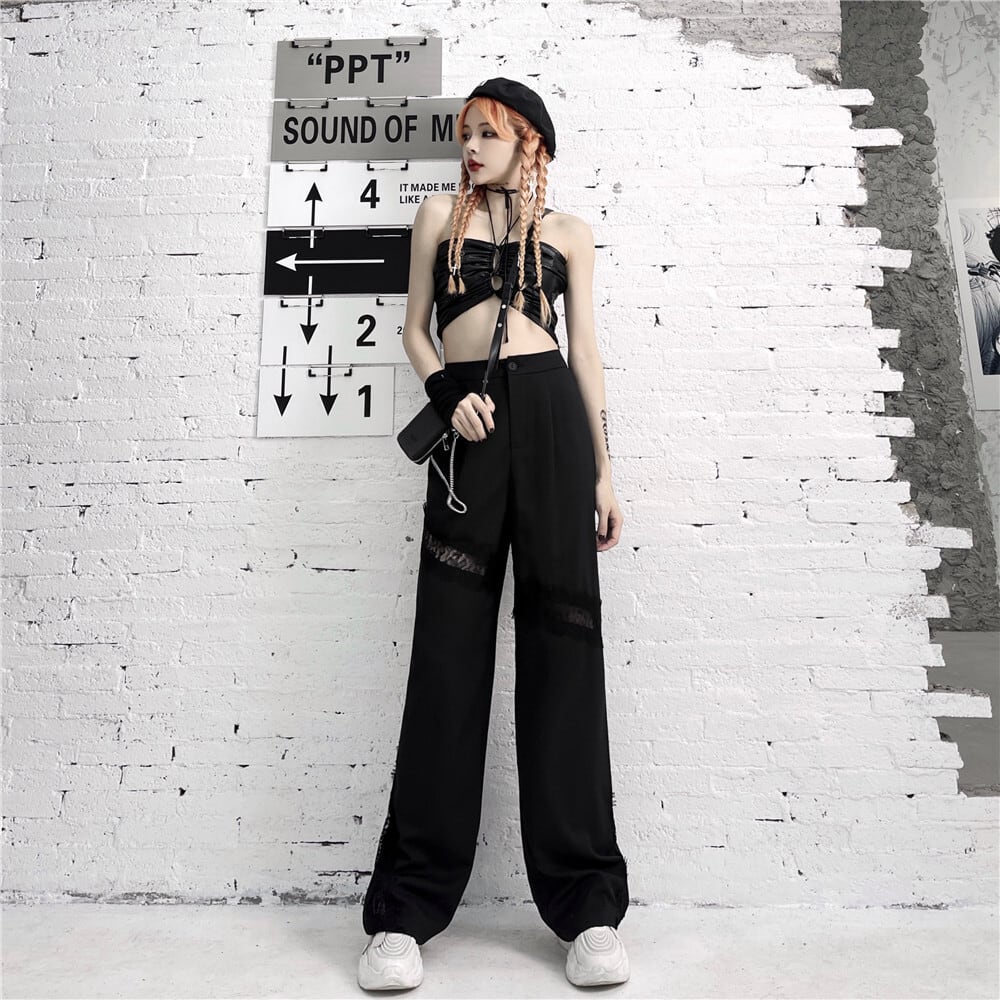 カジュアルパンツ レディース夏服トレンドスタイルブラックレースルーズ ストリート 原宿 夏物 ステッチ デーモン81379126498