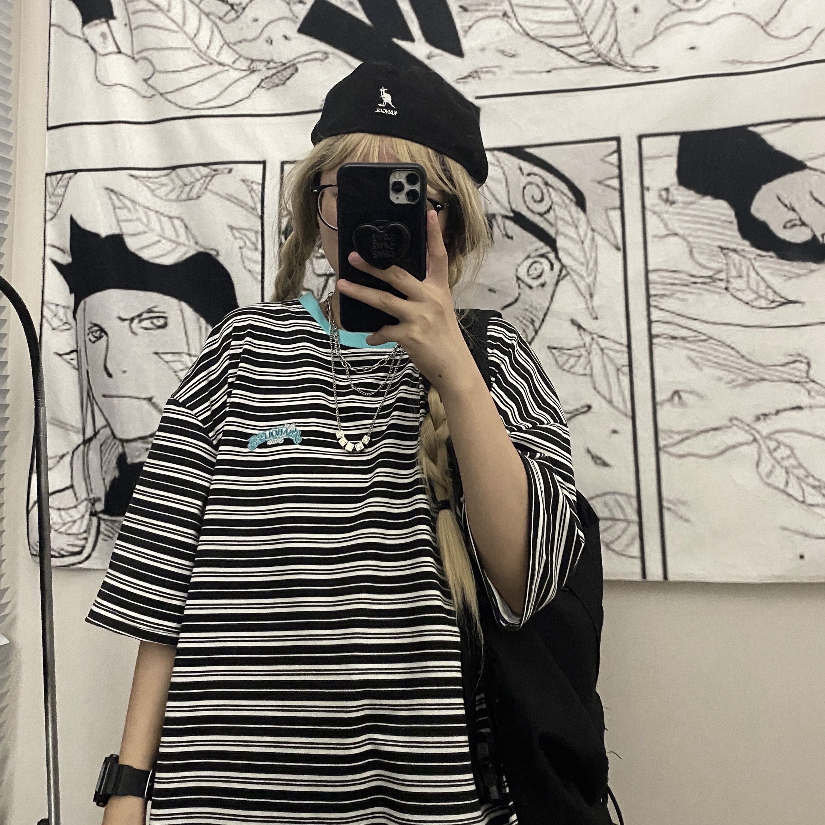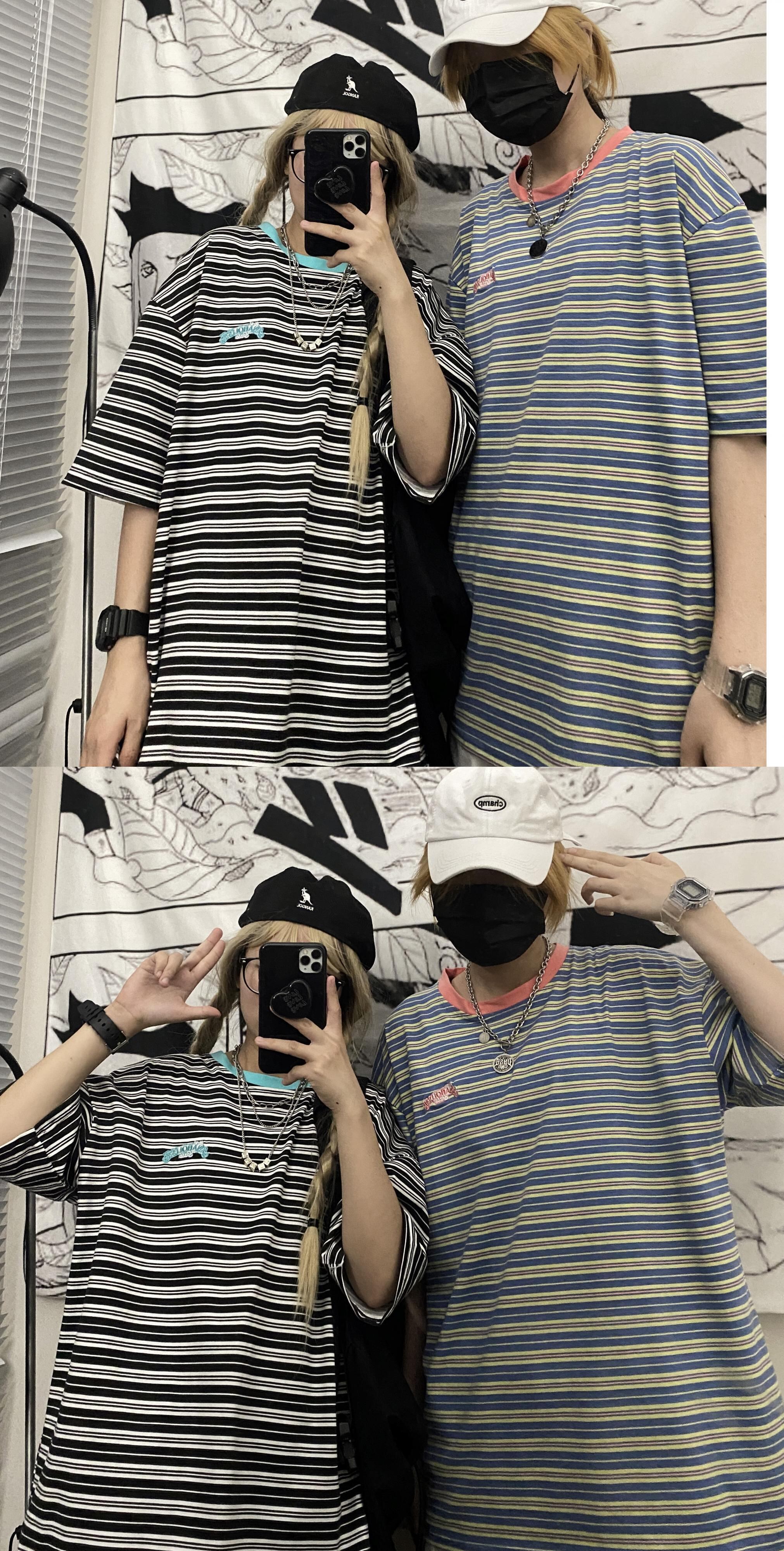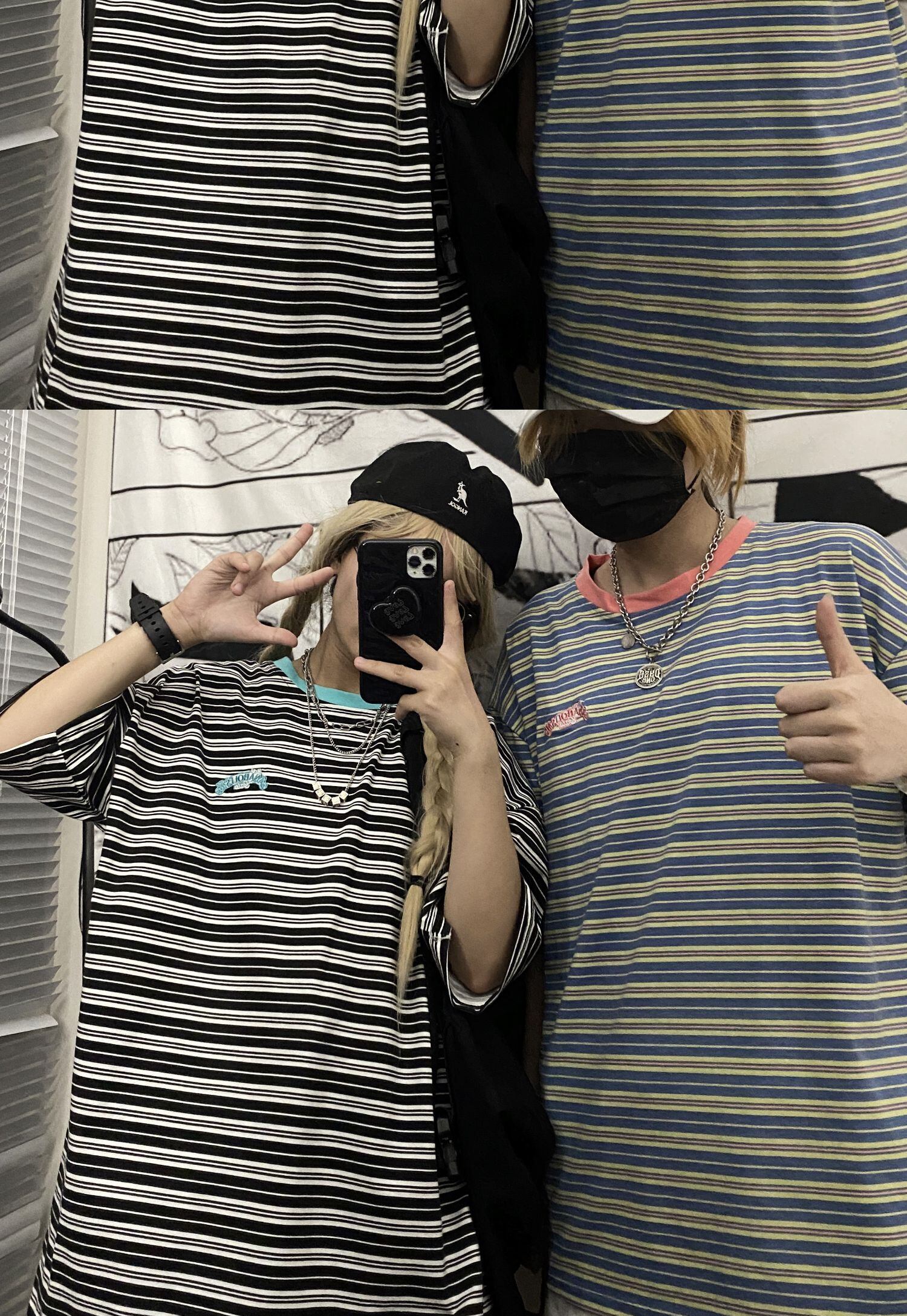 ストライプTシャツレディース夏服韓国ファッショントレンドスタンダードカラールーズラウンドネック半袖スリーブトップス ショート レトロ ハーフスリーブ 夏物 Oネック スタイル デーモン72591761295