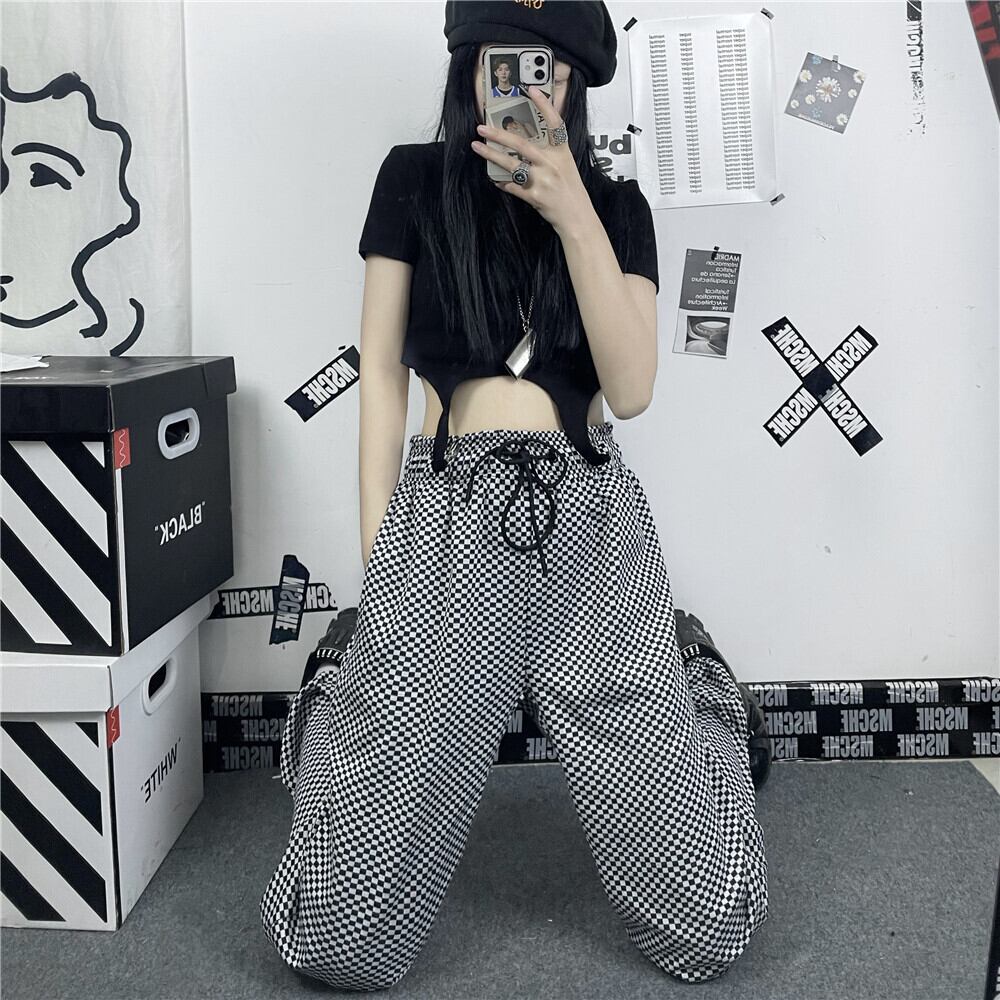 レディース夏服トレンドブラックホワイト格子柄カジュアルパンツ ルーズハイウェストウェスト ストリート 夏物 ハーネス ベルト ボーイズ ウエスト デーモン26410924735