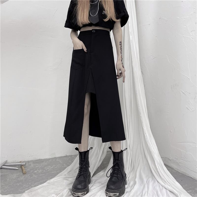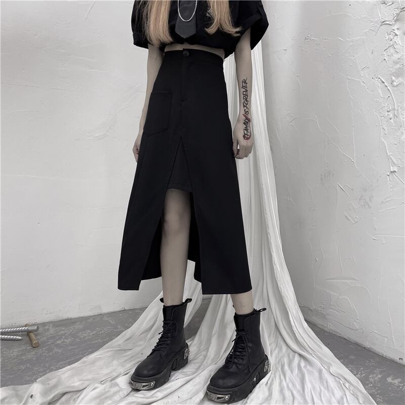 ダークブラックスカート レディース夏服トレンドハイウェストウェスト薄手Aライン 夏物 ウエスト ミドル丈 デーモン25836895195
