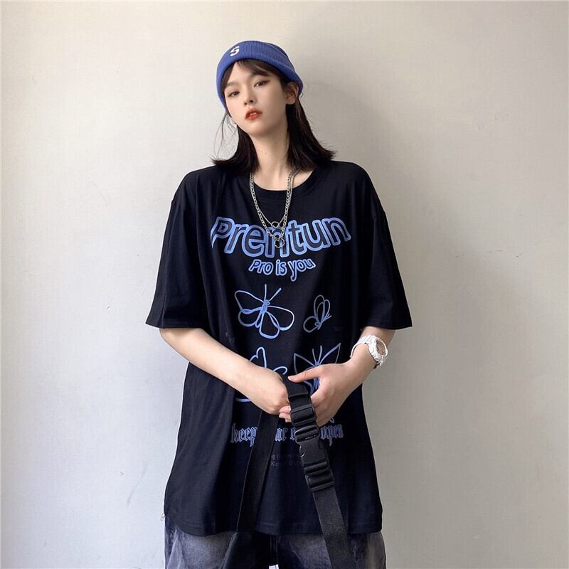 韓国ファッショントレンドButterflyデザイン プリントブラックホワイトルーズTシャツトップス CHIL24682023347