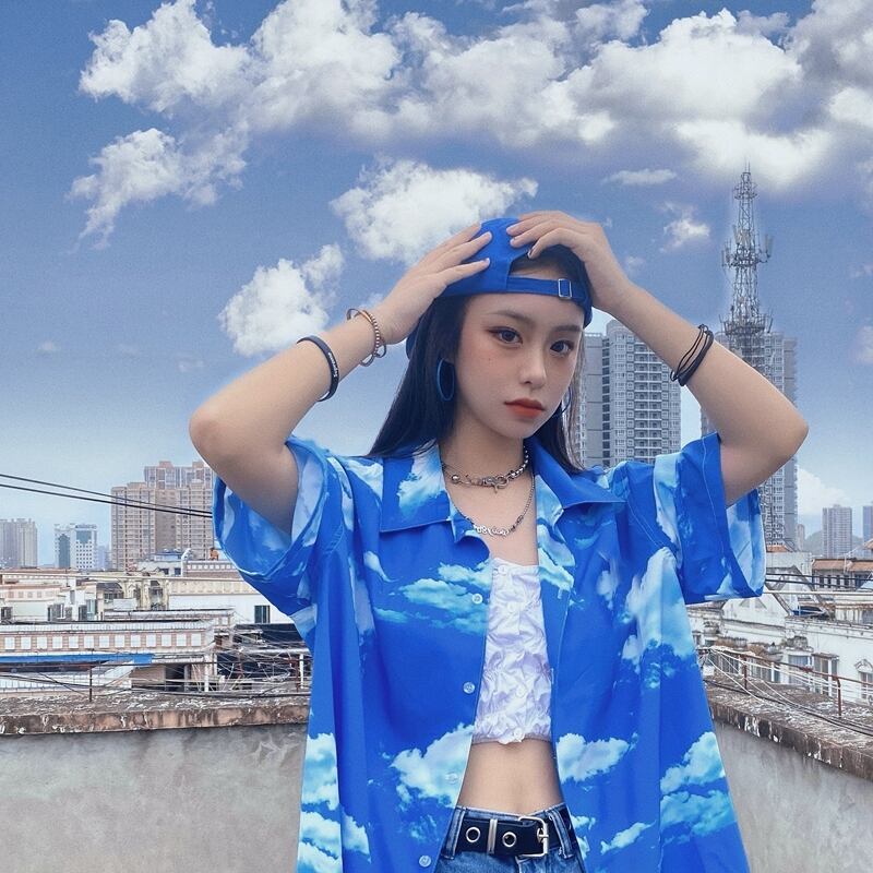 スタイル韓国ファッションブループリント柄ルーズシャツ トップス 原宿 CHIL49295123934