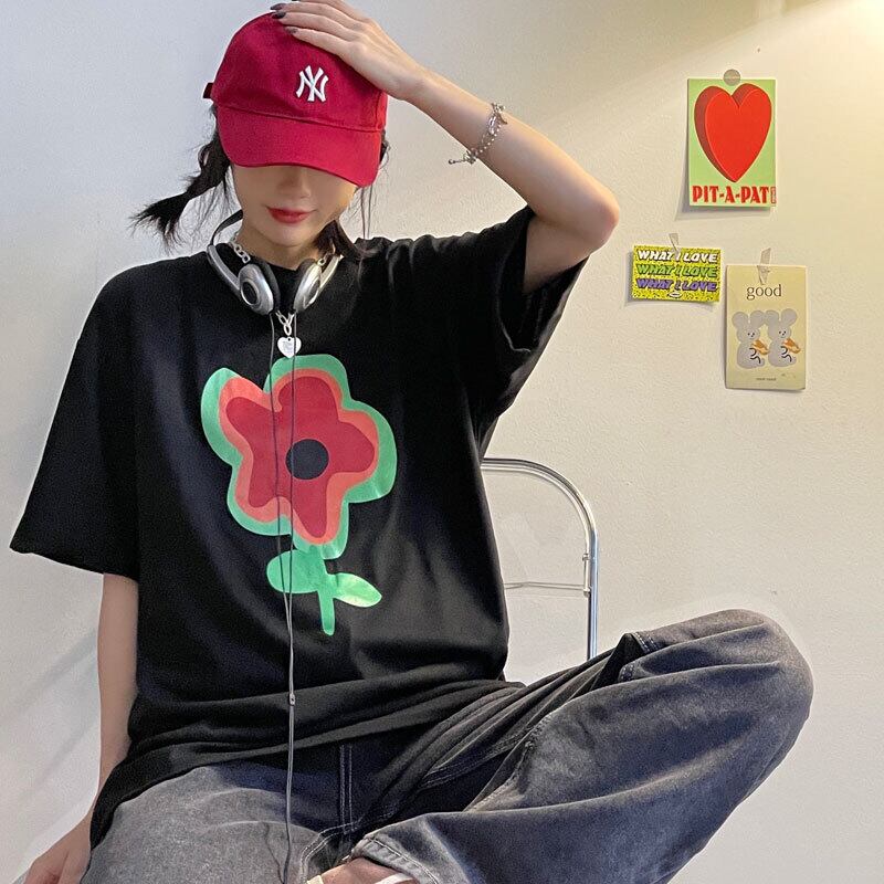 ブラックTシャツレディース夏服韓国ファッショントレンドレッドFlowerデザイン プリントルーズトップス 夏物 フラワーデザイン ボーイズ スタイル デーモン46283809237