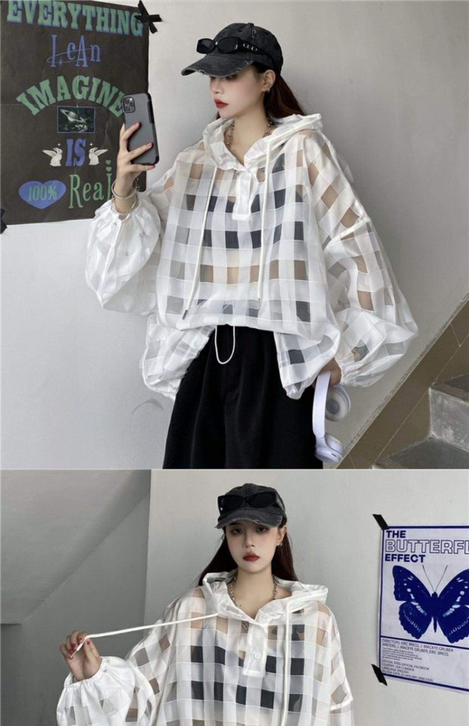 トップス レディース夏服トレンドスタンダード格子柄ルーズカジュアルフードジャケット ロング レトロ 夏物 ボーイズ 長袖 デーモン48169036086