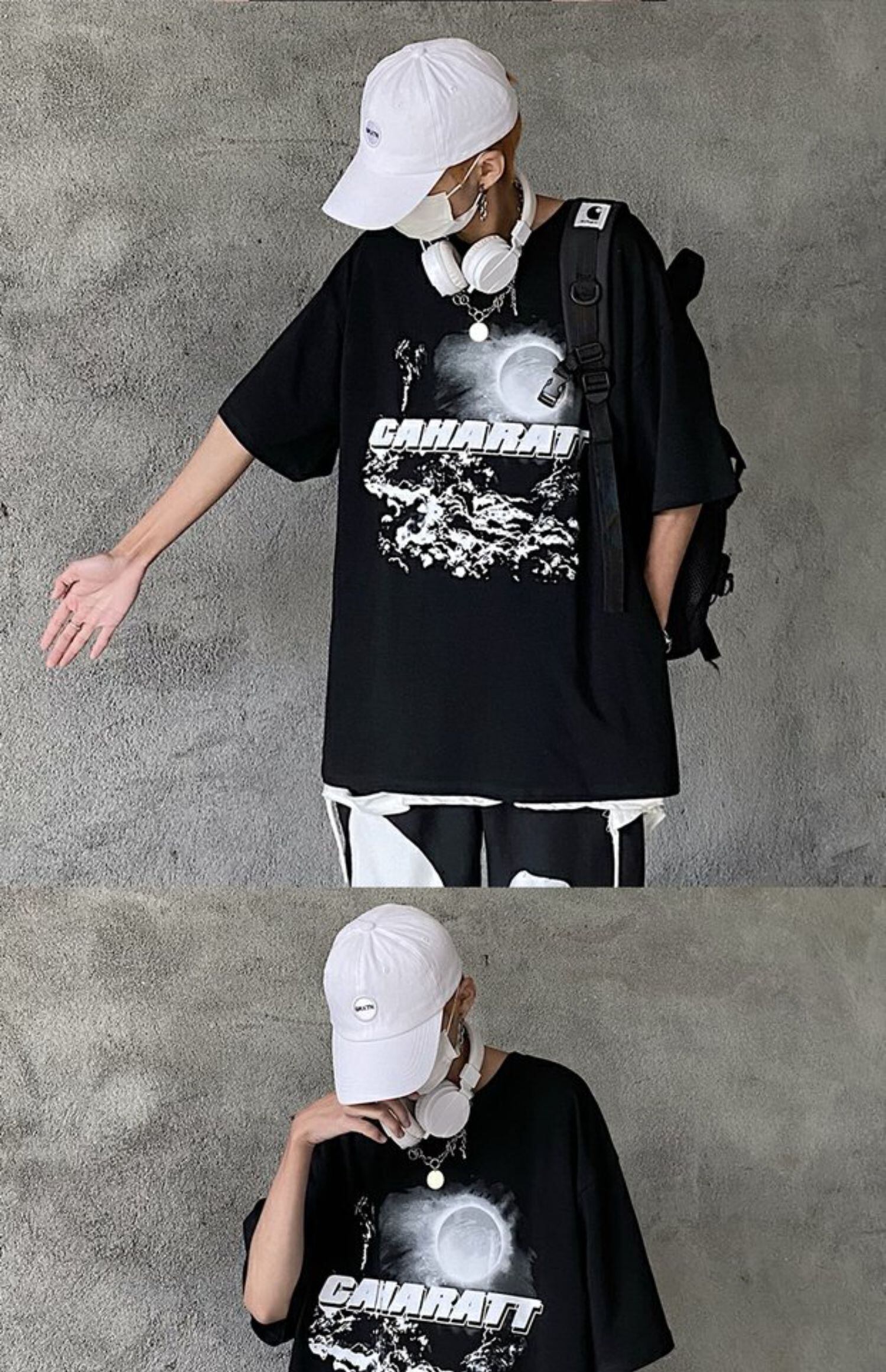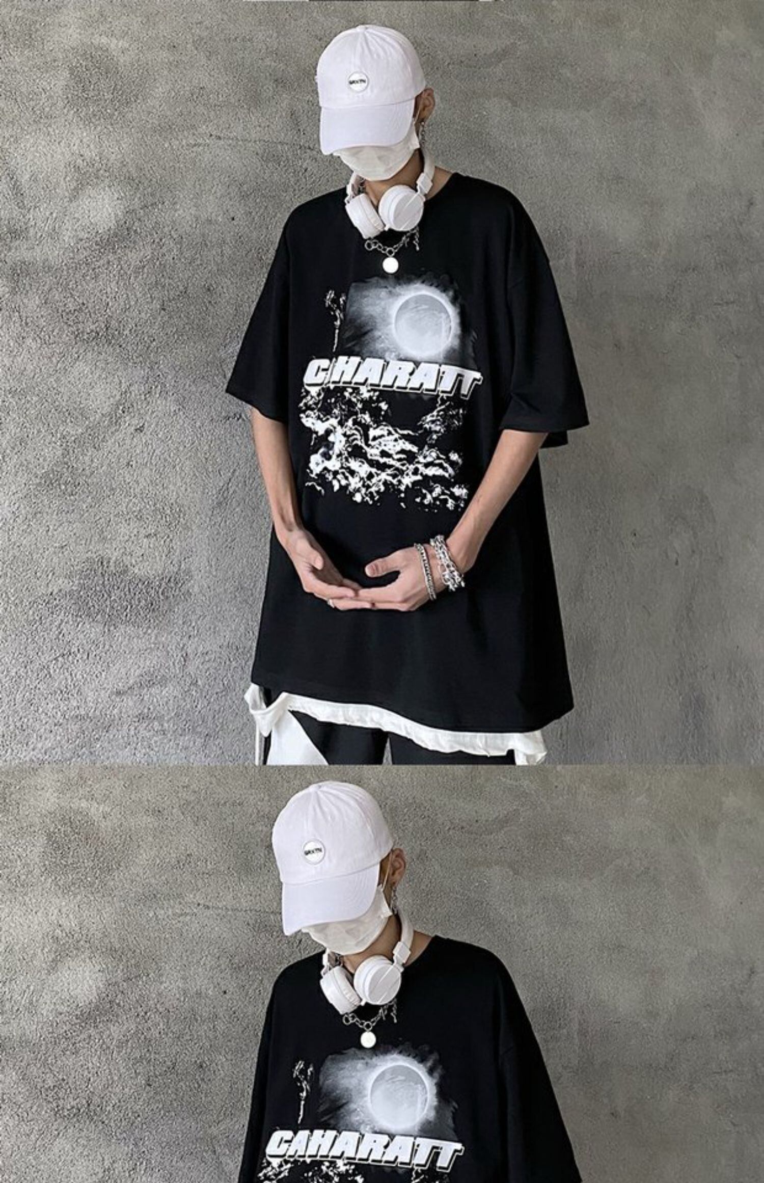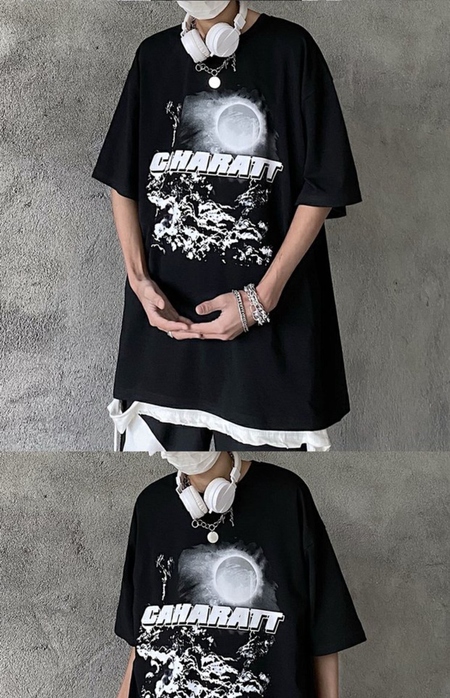 トップス Tシャツ夏服韓国ファッショントレンドダークスタンダードプリント柄ルーズラウンドネック半袖スリーブ ショート レトロ ハーフスリーブ 夏物 Oネック スタイル デーモン15499692958