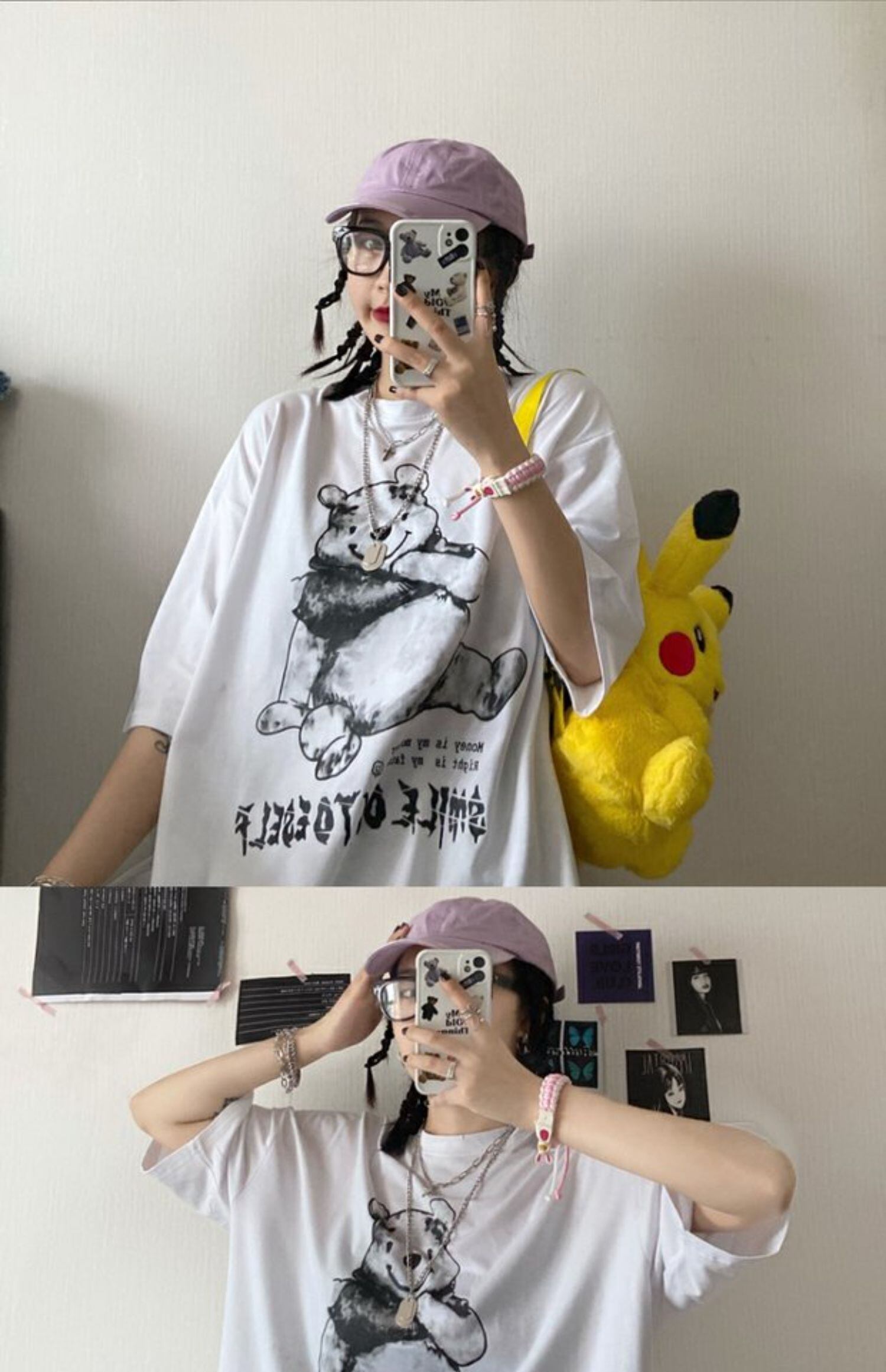 夏服Tシャツレディース韓国ファッショントレンドスタンダードプリント柄ルーズラウンドネック半袖スリーブトップス ショート レトロ ハーフスリーブ 夏物 Oネック スタイル デーモン49801308199