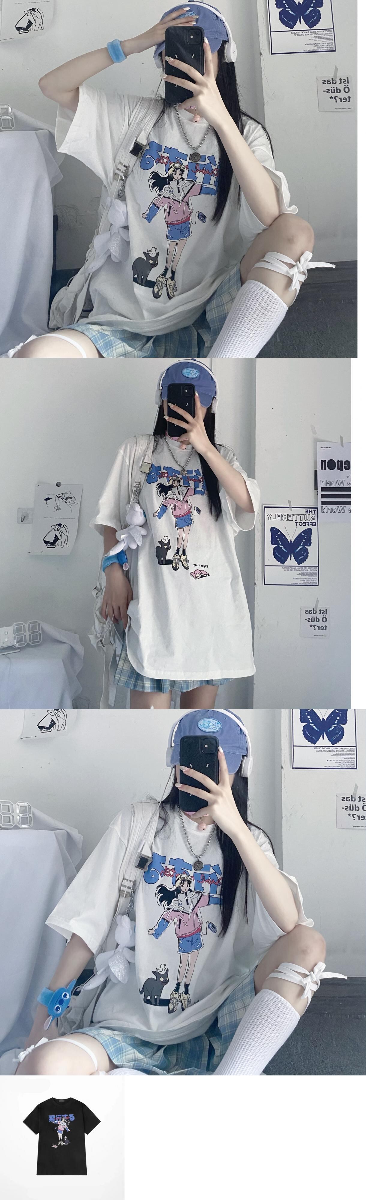 ホワイトTシャツレディース夏服韓国ファッショントレンドプリントルーズトップス 夏物 スタイル デーモン66787327809