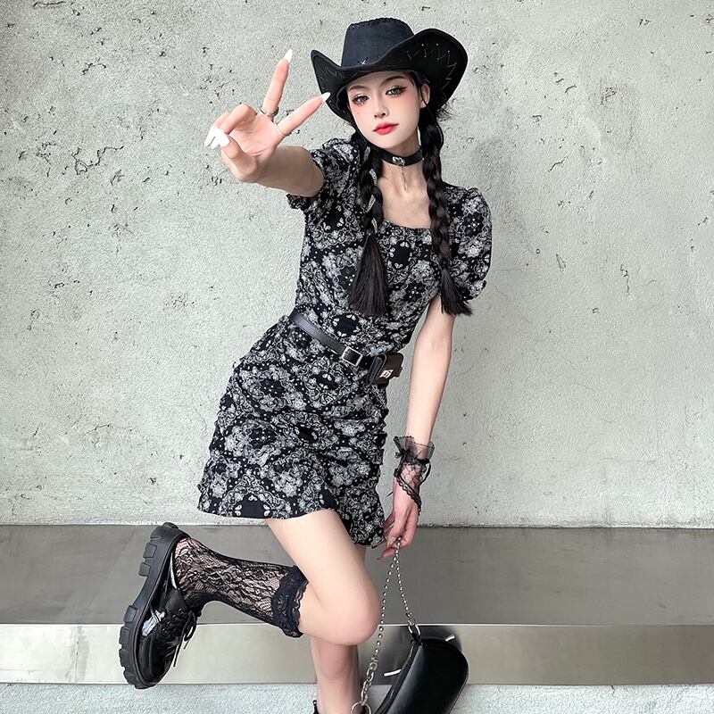 ワンピースレディース夏服トレンドダークスタンダードFlowerデザイン スリーブAラインスカート レトロ 夏物 フラワーデザイン デーモン65200585711