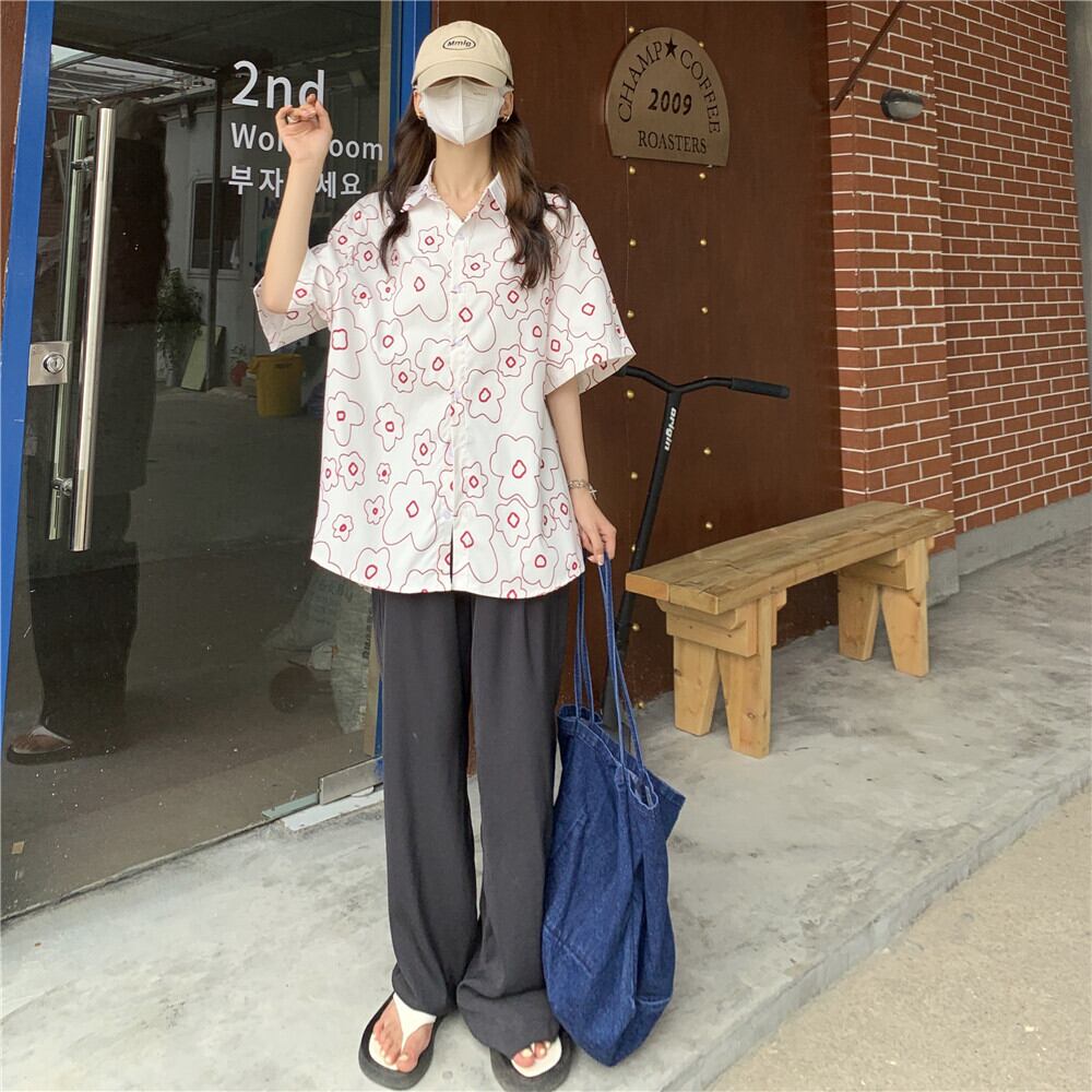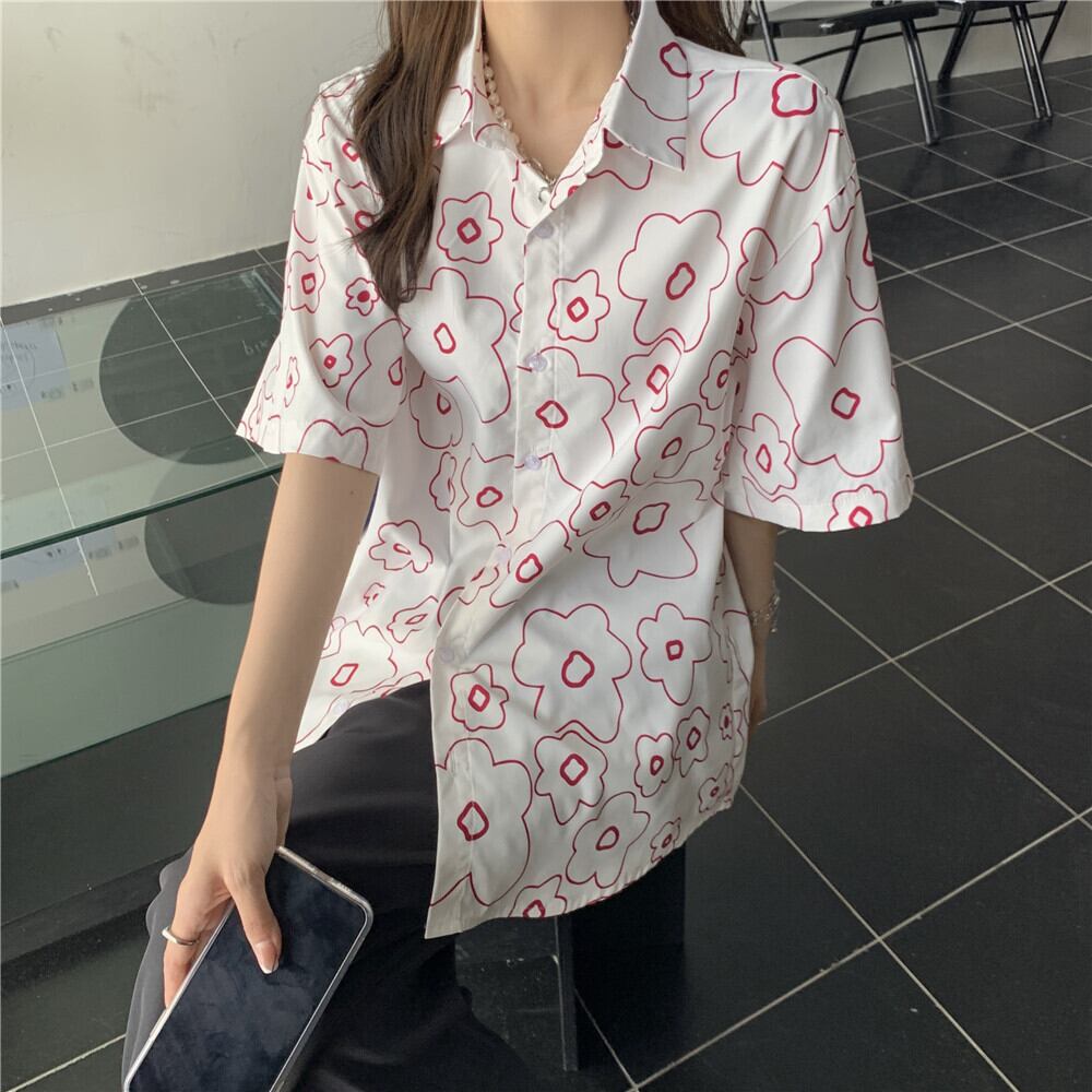 シャツ レディース夏服レッドFlowerデザイン スタンダードカジュアルスタイル レトロ 夏物 フラワーデザイン CHIL80188104201