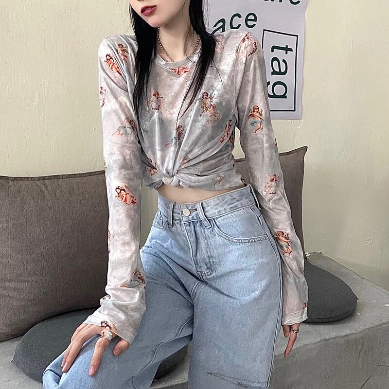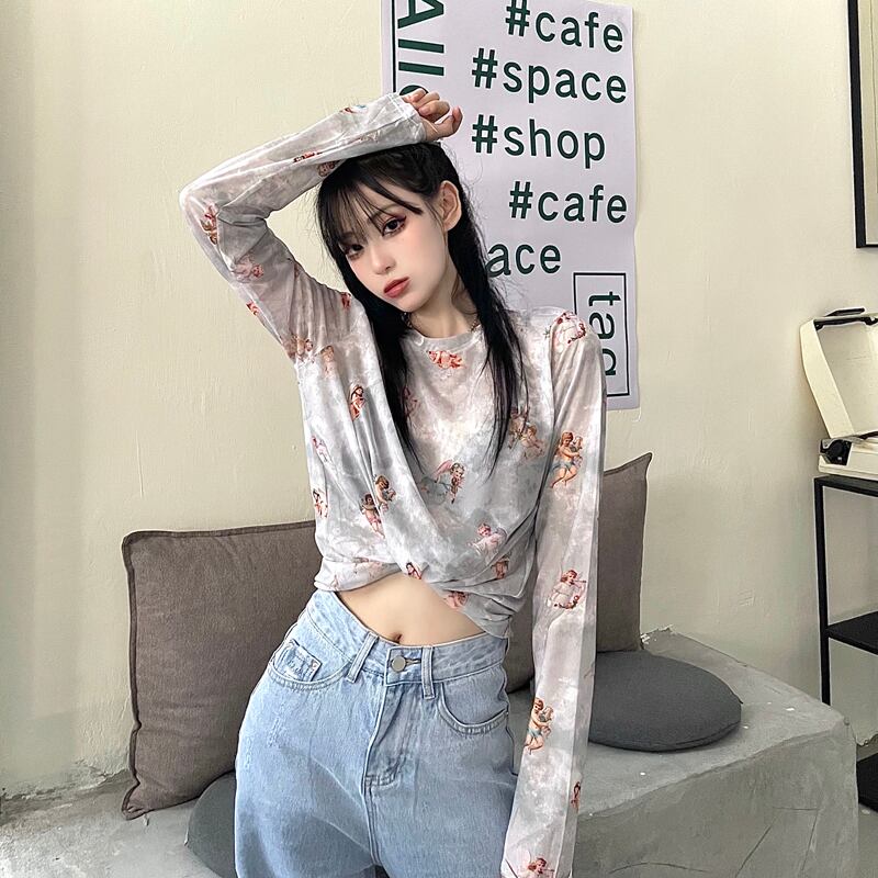 トップス レディース韓国ファッショントレンド薄手プリント柄ルーズゆったりTシャツ ロング スタイル 長袖 デーモン24454249083