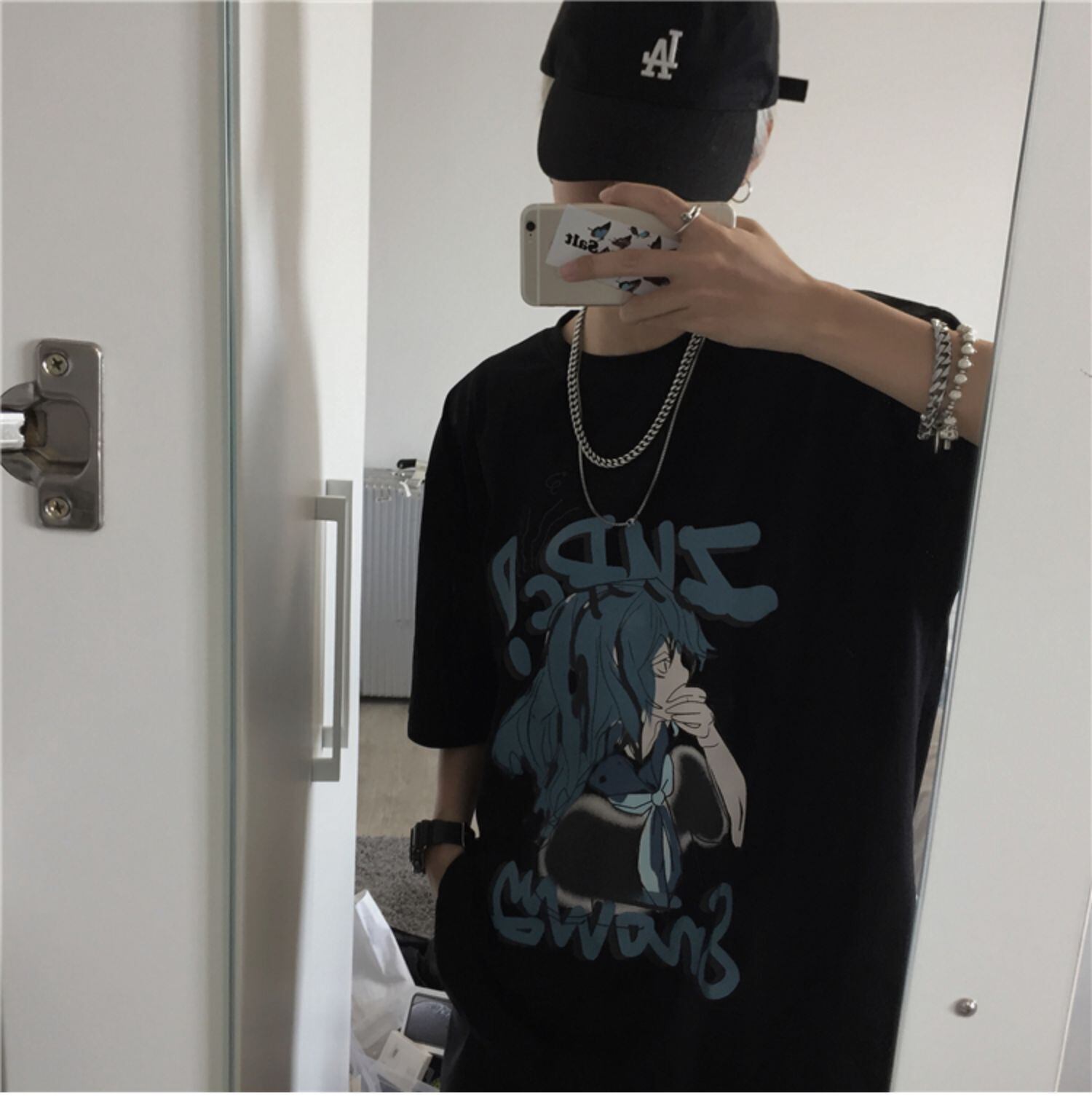 夏服韓国ファッショントレンドスタンダードプリントTシャツルーズブラックトップス レトロ 夏物 スタイル デーモン6332538