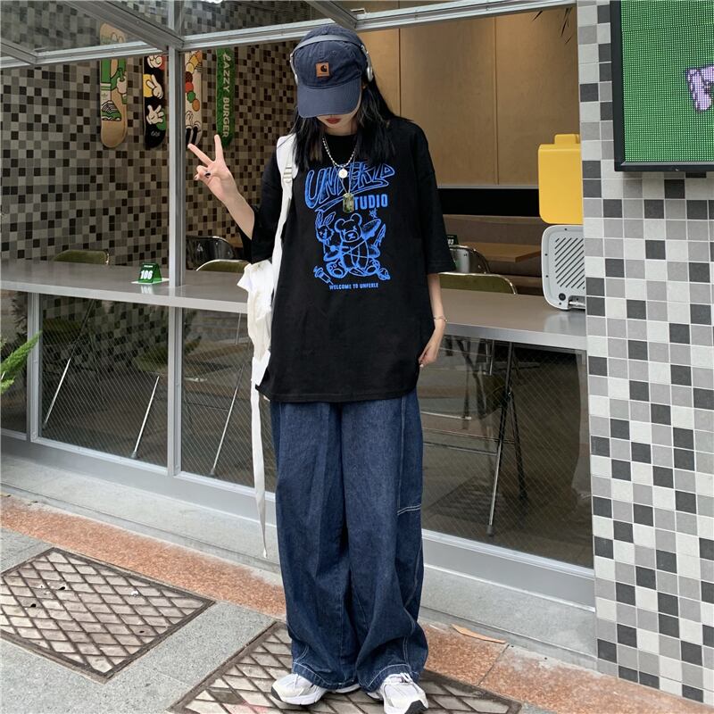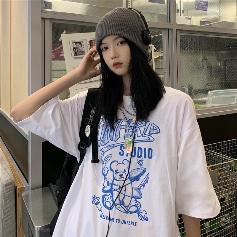 夏服レディース韓国ファッショントレンドスタンダードプリントホワイトルーズトップス Tシャツ レトロ 夏物 スタイル デーモン36801381429
