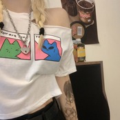 Tシャツ夏服レディース韓国ファッショントレンドストラップレスショートホワイトルーズプリント柄トップス 夏物 スタイル デーモン26744231912